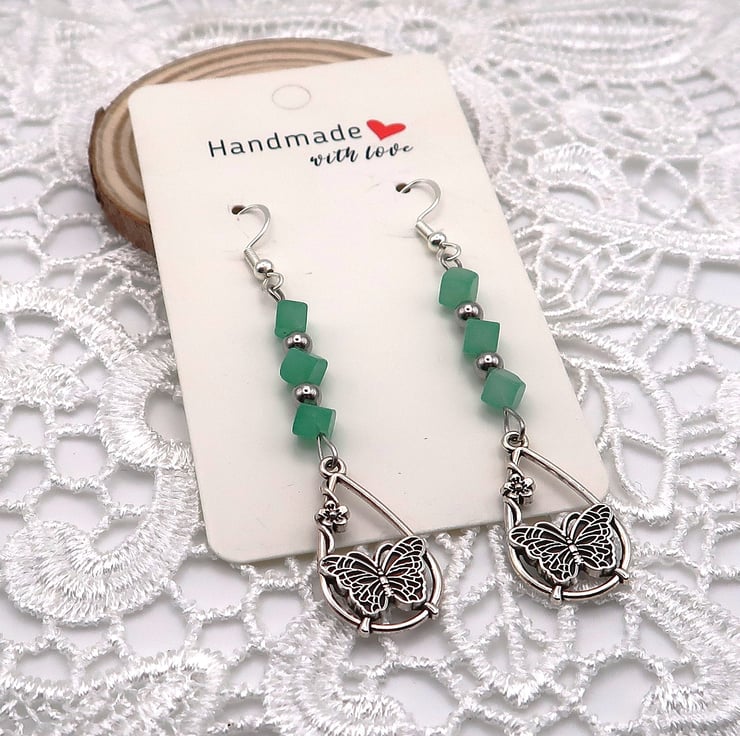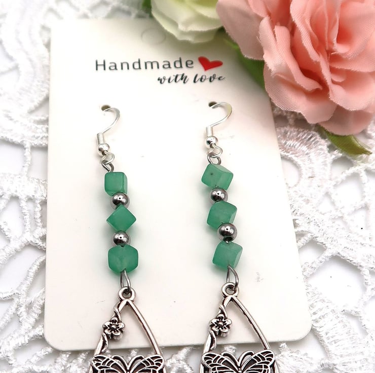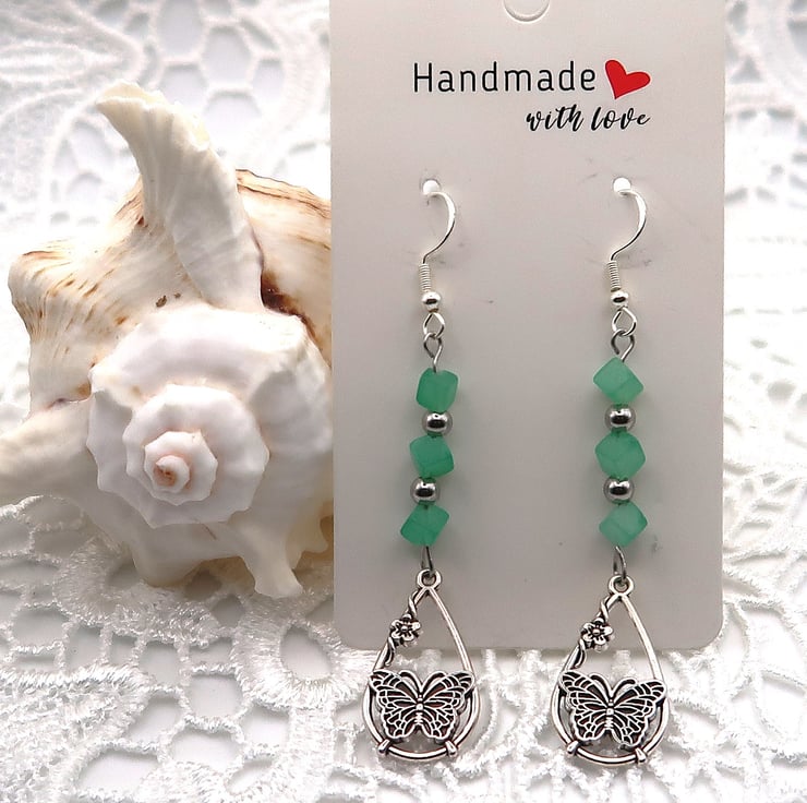 For these Beautiful Earrings I have used 4mm Jade Cube Beads, 4mm Stainless Steel Beads (won't tarnish), Silver Plated Butterfly Teardrop Charms and Sterling Silver Earring Wires.