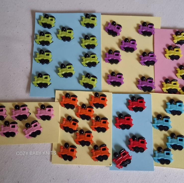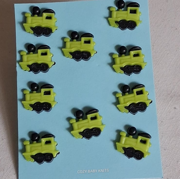10 Plastic green buttons. They come in two parts. The body is detachable from the back. Has a shank on the back to attach to your item.