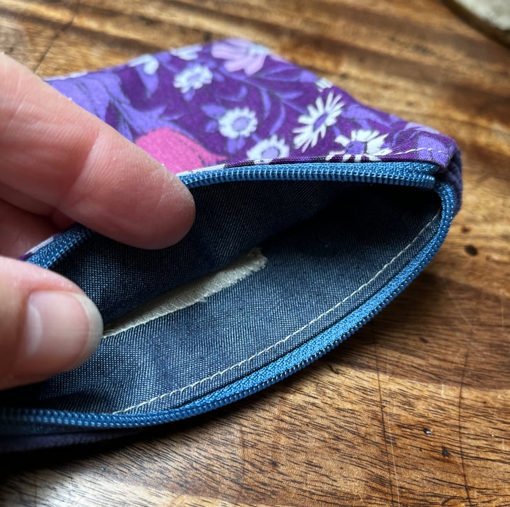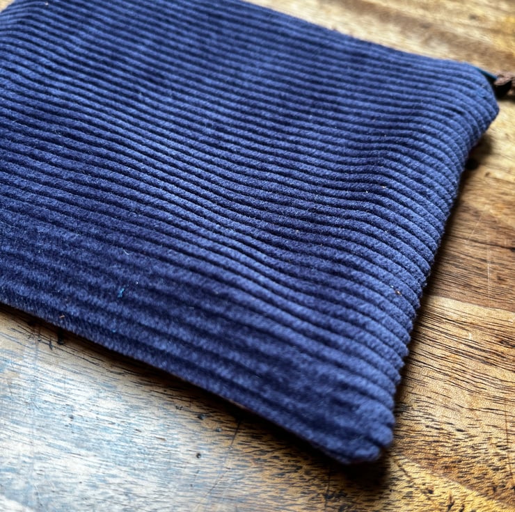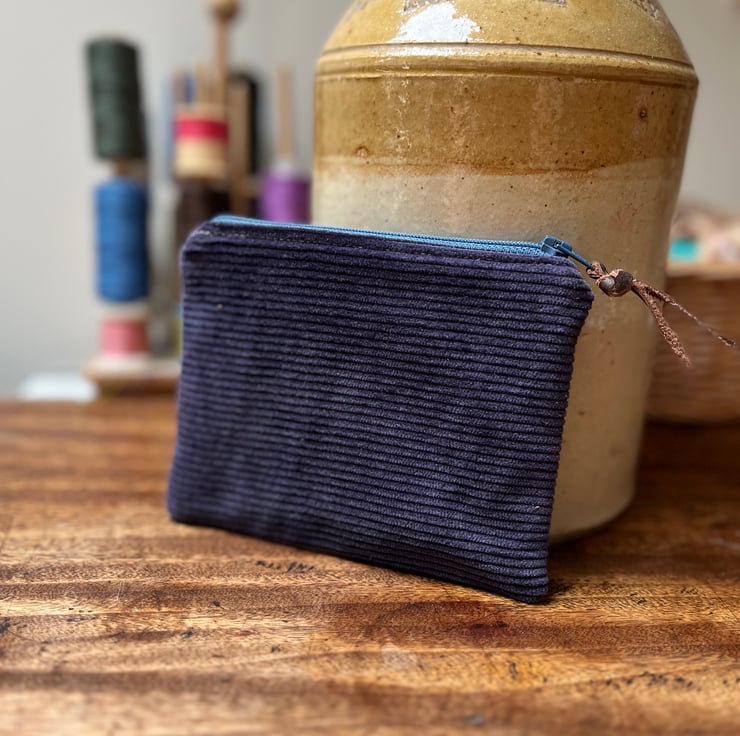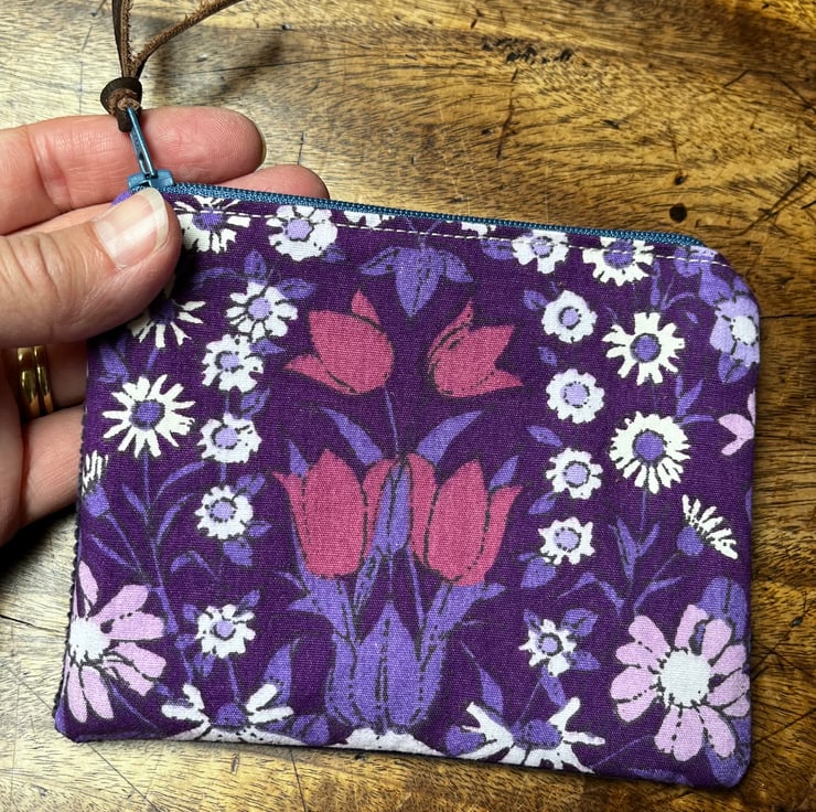 A strip of leather is tied to the zip pull. The leather was waste from an local upholsterer. This can be swapped for ribbon if preferred, just add a note at checkout.