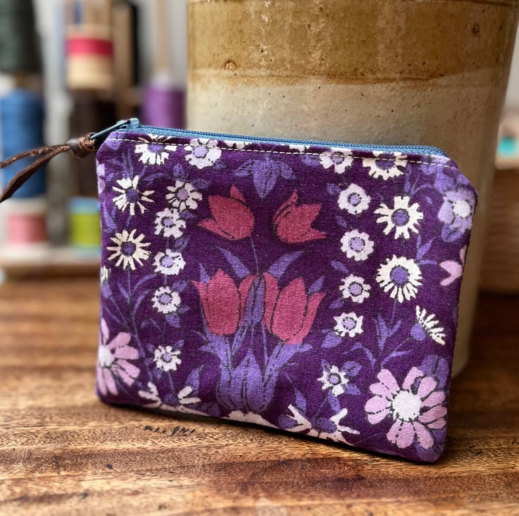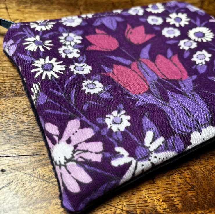 Pretty retro print coin purse or small zip pouch made from vintage Daisy Chain reclaimed cotton fabric from the 1970s. The purse is backed with dark purple corduroy from a sample swatch and is lined with denim coloured fabric from another sample swatch.