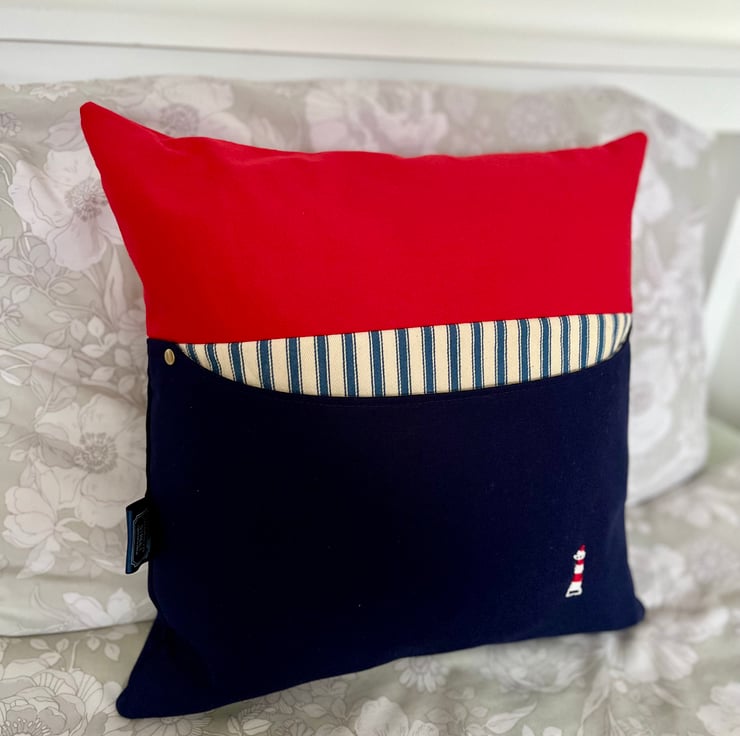 Seaside Cushion Cover – Navy Red White Stripes, Lighthouse & Handy Pocket, 40cm