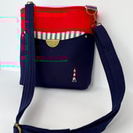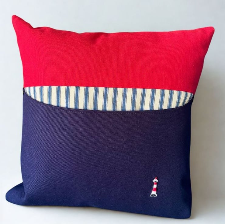 Bring a touch of seaside charm to your home with this handmade nautical cushion cover, crafted in navy, red and blue and white stripes and finished with a beautifully embroidered lighthouse. Perfect for adding a coastal accent to your living room, bedroom, or beach house retreat.