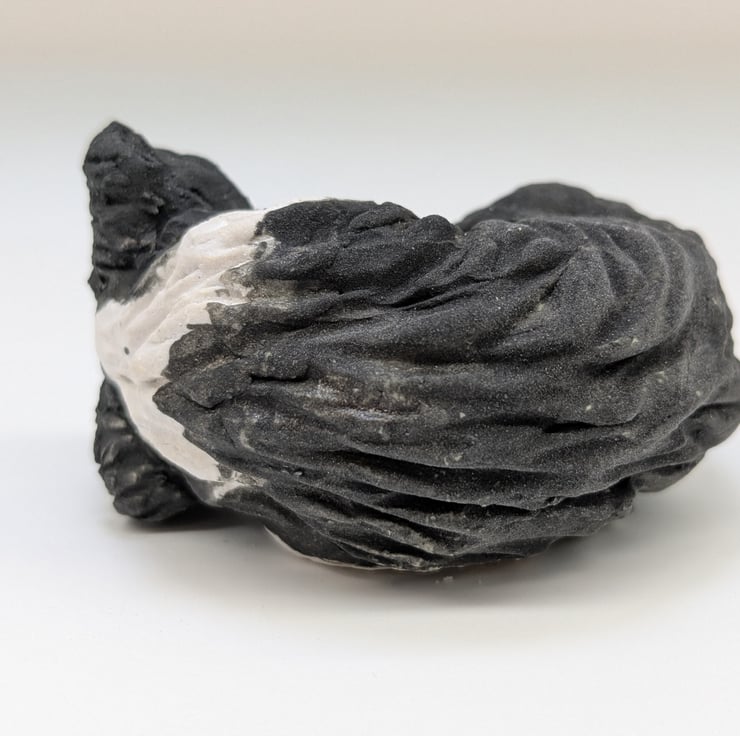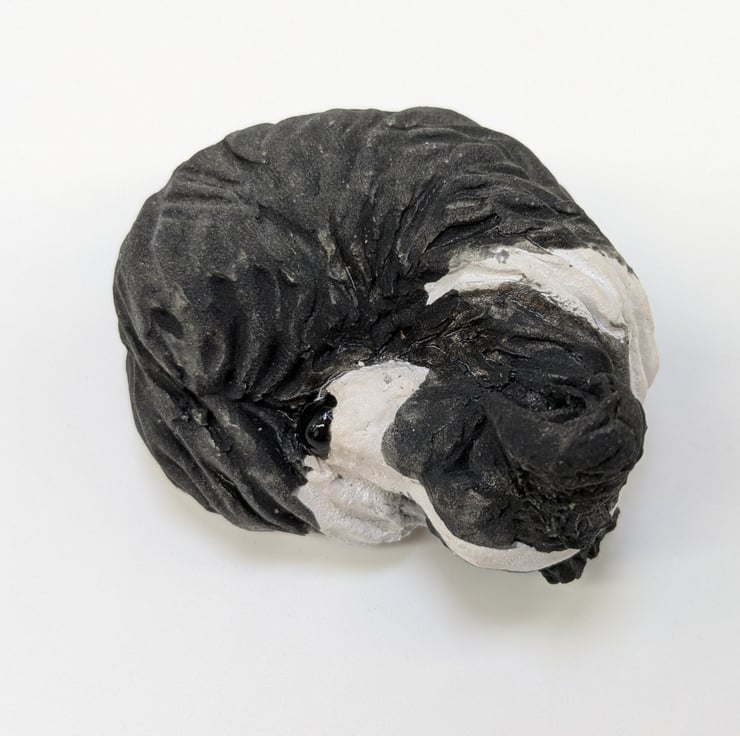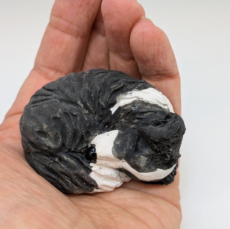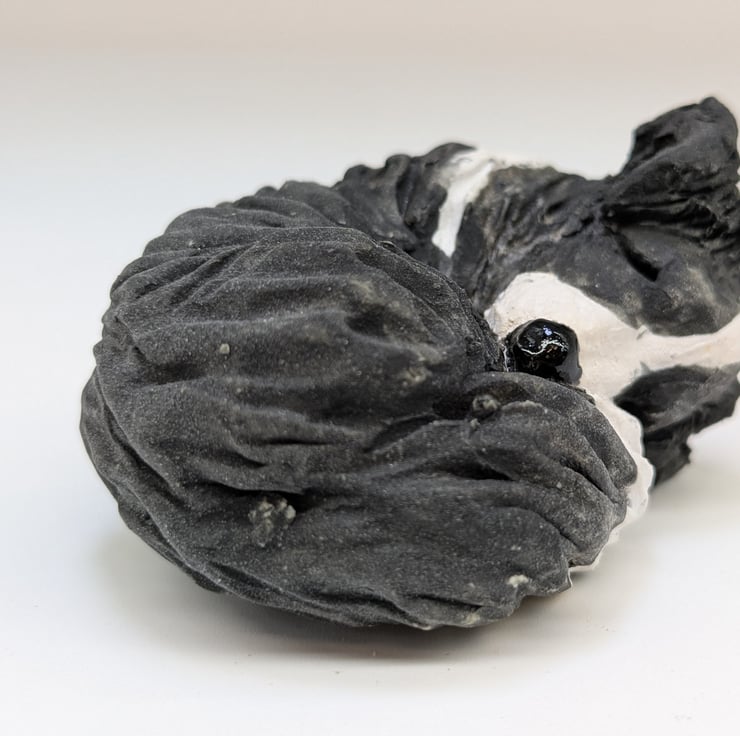 This mini collie dog is handmade in stoneware clay and measures 6 x 4.5 x 3.5cms.