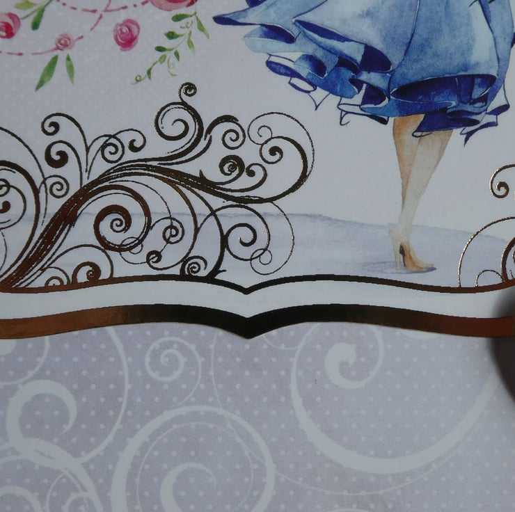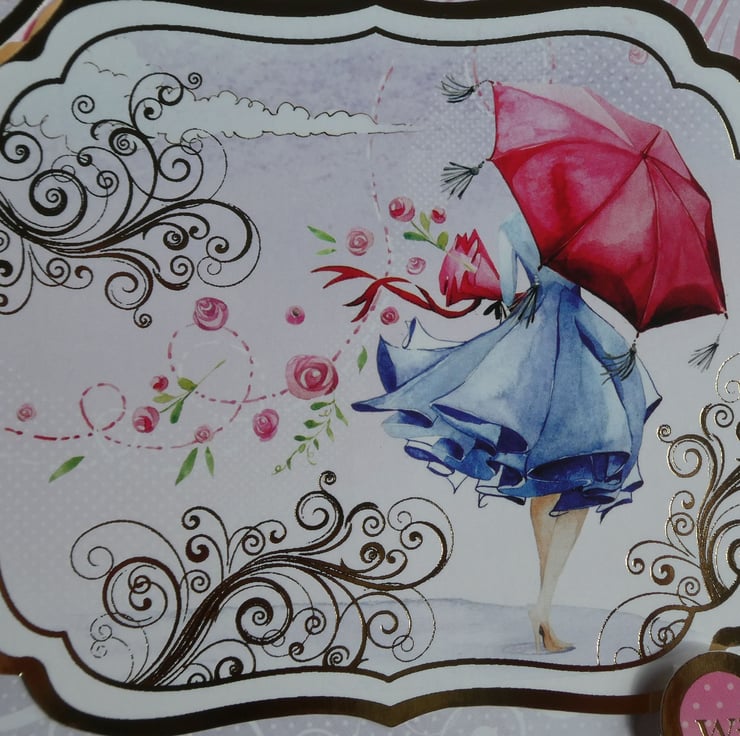 A printed background of pink and white scrolls on dotty pale pink and grey backgrounds has a central printed topper with the image of a woman wearing a blue coat and carrying a red umbrella and bouquet of flowers.