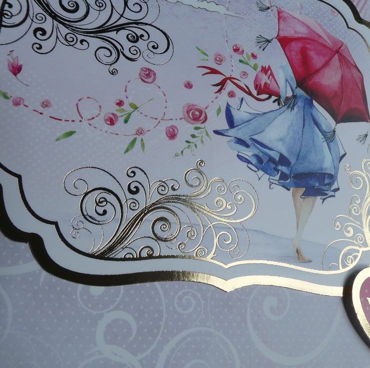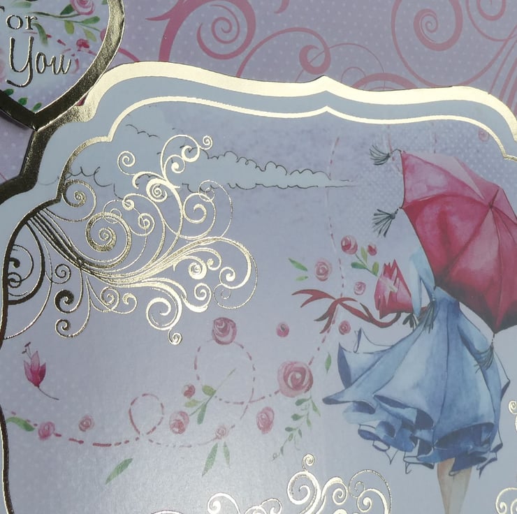 This elegant birthday card in shades of pink, blue and grey has an image of an elegant girl holding a red umbrella and bouquet of flowers. With the messages For You, With Love & Especially For You On Your Special Day.