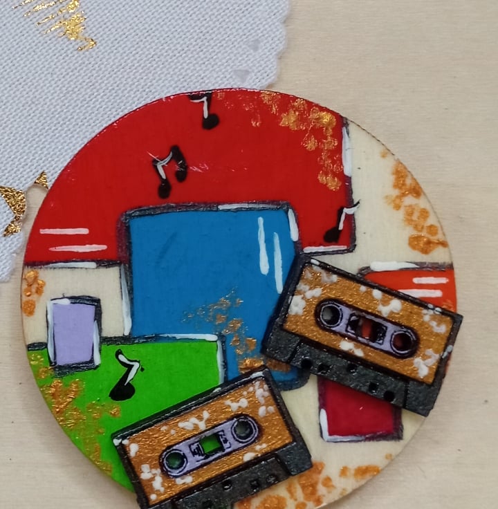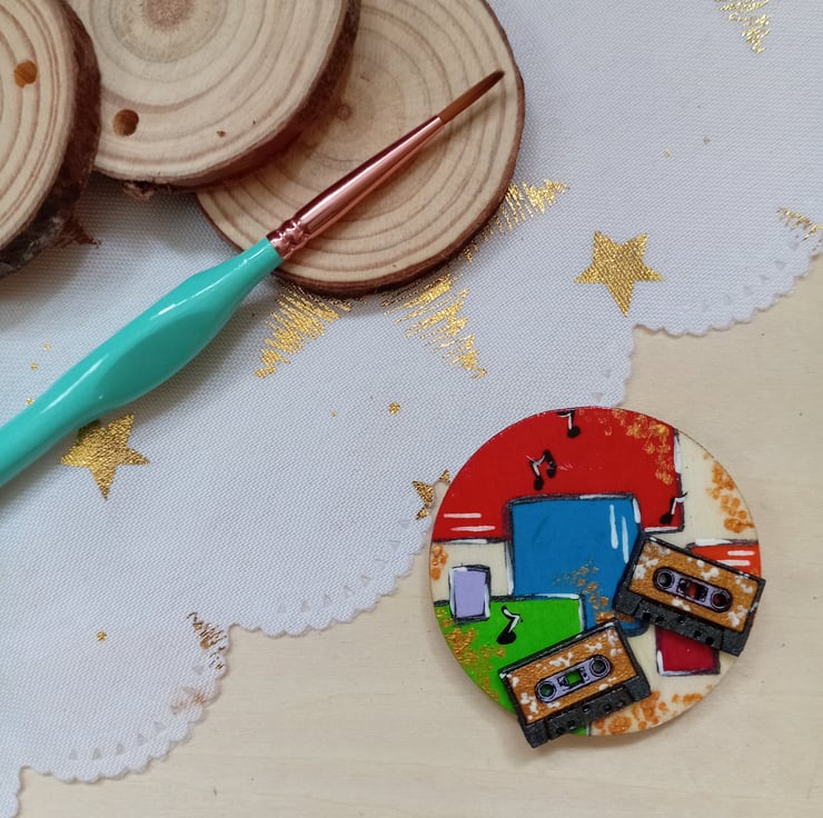 A 4cm round wooden Fridge Magnet that has been hand painted with a colourful retro style design and features 2 raised gold and black cassette tapes