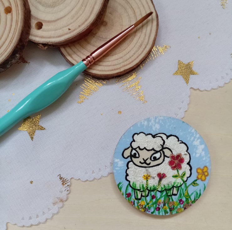 A 4cm round wooden Fridge Magnet that has been hand painted with a spring design featuring a lamb and spring flowers
