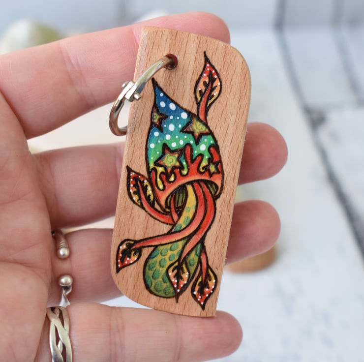 A cute wood burned keyring with a bright and unusual jellyfish mushroom design, coloured in art pencils and inks and then varnished.