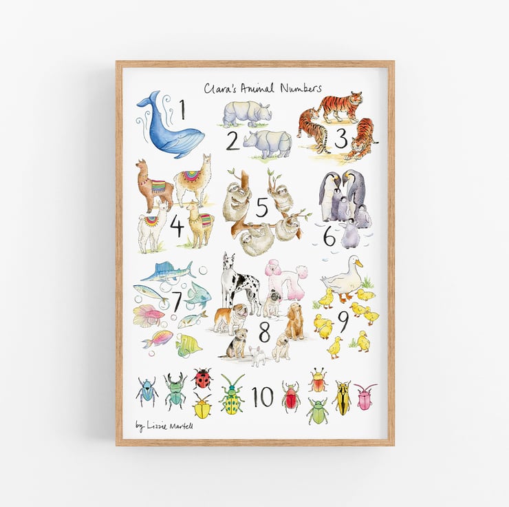 Bring playful learning and vibrant colour to your home with this A3 art print "My Animal Numbers" by Lizzie Martell Illustration. Count along with a parade of friendly creatures - from one happy whale to ten tiny insects - each number is paired with characterful animals that are sure to spark wonder in young minds as they learn how to count.