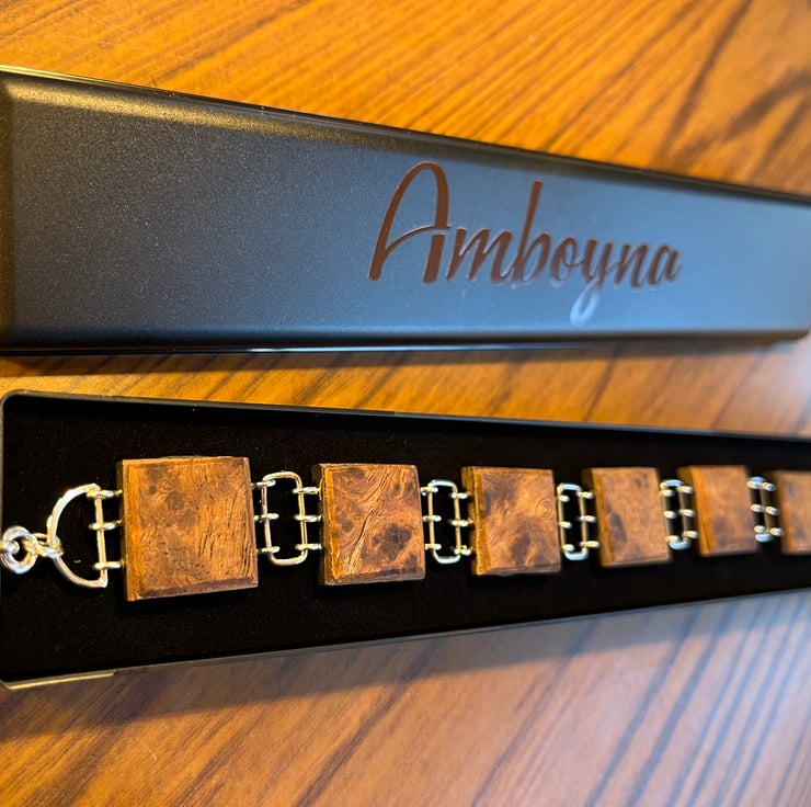And now for something completely different... I wanted to design and produce a totally unique bracelet and here it is. Hand crafted from Walnut, beautiful Amboyna wood, Rhodium plated brass and Sterling Silver parts; this bracelet has a presence on the wrist without being ostentatious. Amboyna wood is among the most expensive and sought-after of all burls and is commonly used for fine furniture. It has also been used by Rolls Royce to finish their interior trims. Rhodium is a rare, hard, corrosion-resistant and tarnish-resistant metal, belonging to the platinum group. It's highly reflective and is known as the world's most expensive precious metal. This bracelet is light and comfortable to wear. The bracelet comes in a recycled ECO impact-resistant plastic box, ensuring product protection.