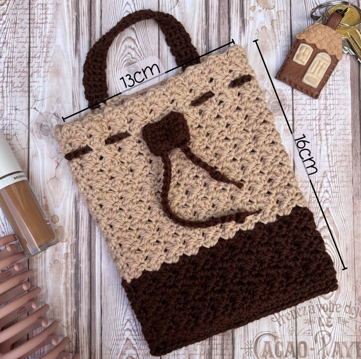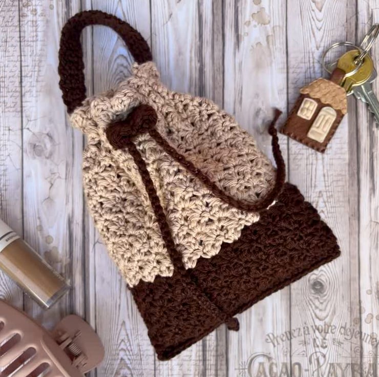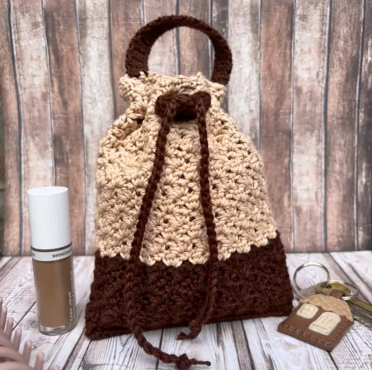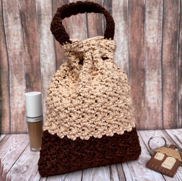 This two-tone bag features a soft beige upper half and a base in rich coffee colour, creating a warm, earthy palette that complements any style. Made with the shell stitch for a unique texture, it is perfect for makeup, small accessories, gifting and so on. Finished with a matching drawstring that will keep your belongings secure, and an also matching handle for easy carrying or hanging.