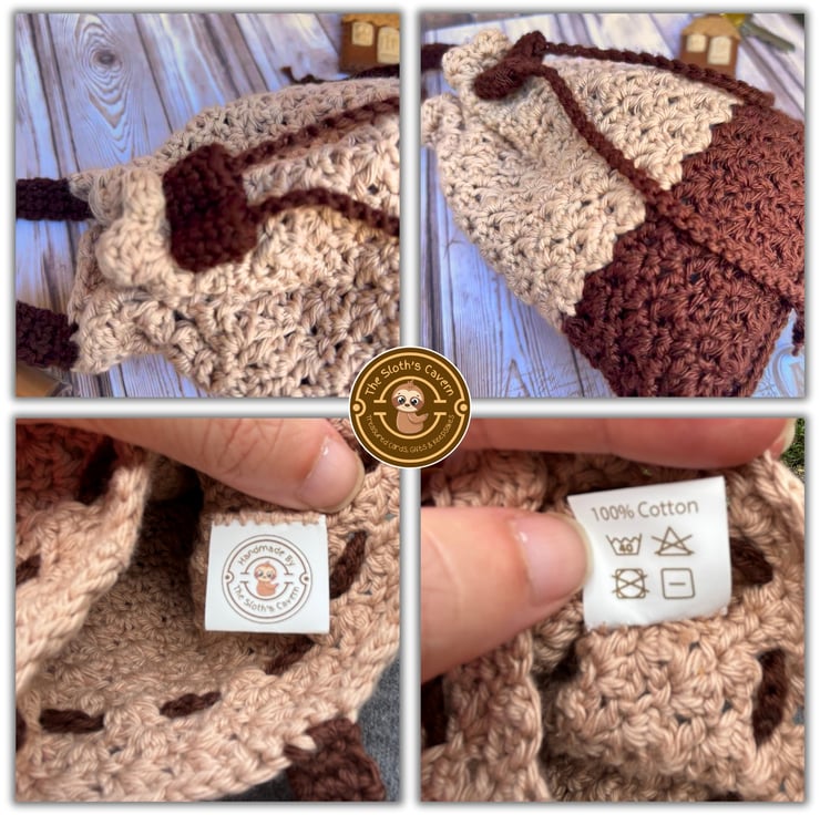 A label with "The Sloth's Cavern" logo and care symbols is sewn on the inside of the pouch.