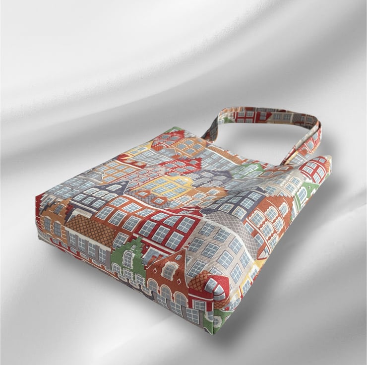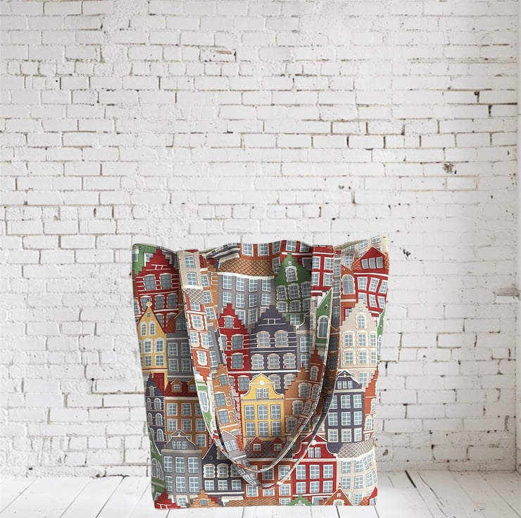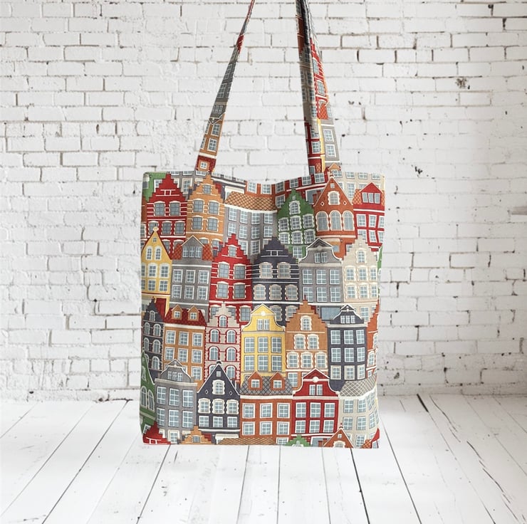 Made with colourful fabric featuring a houses design, it is ideal as a shopping bag, book bag or casual everyday bag.