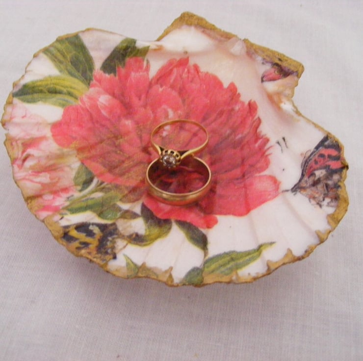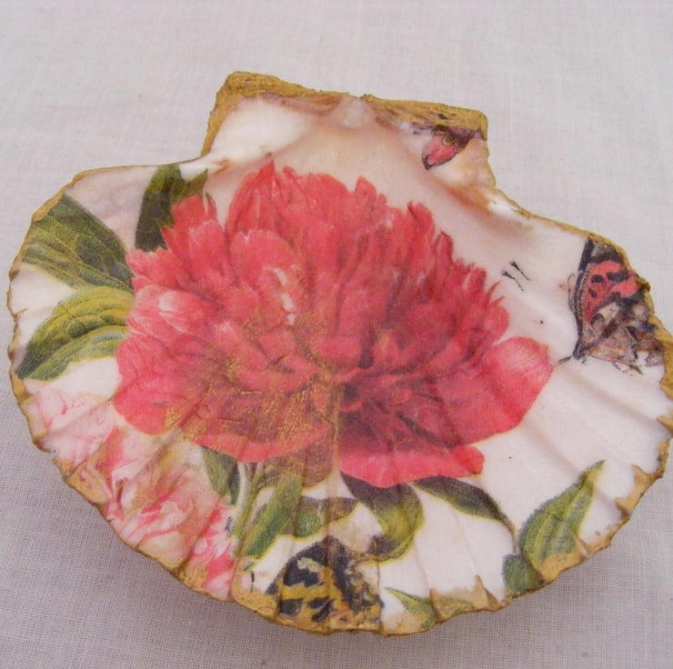 I've handmade this floral trinket dish using a scallop shell which I've decoupaged and varnished. Edges of the dish have gold leaf on. A pretty dish that would look lovely on the dressing table. Perfect for gifting too. Please don't immerse shell in water, as this dish is not waterproof. Wipe clean with a damp cloth.