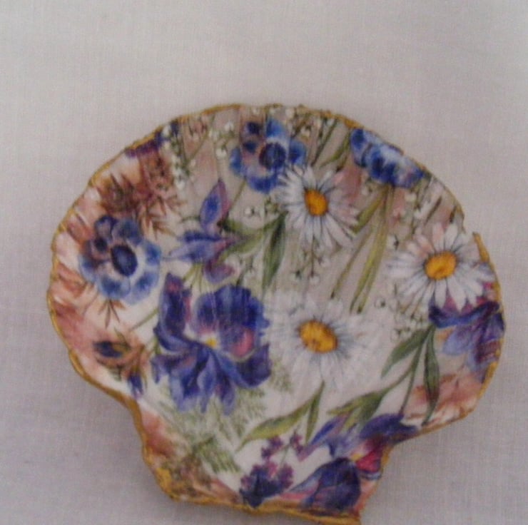 This pretty floral trinket dish would make a lovely gift. I've made the dish with, a scalloped shell, napkin, glue, varnish and gold leaf. Dish is not waterproof. Wipe clean with a damp cloth.