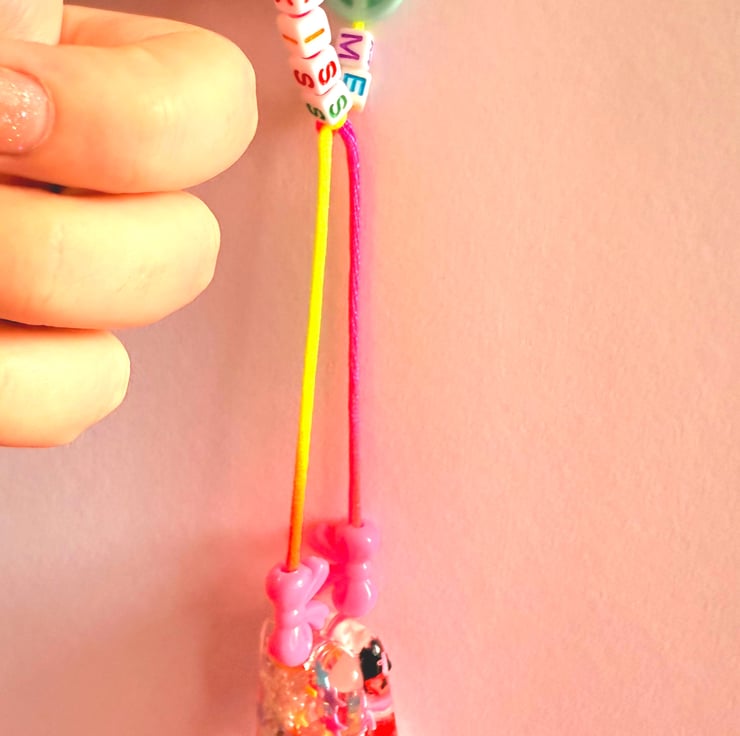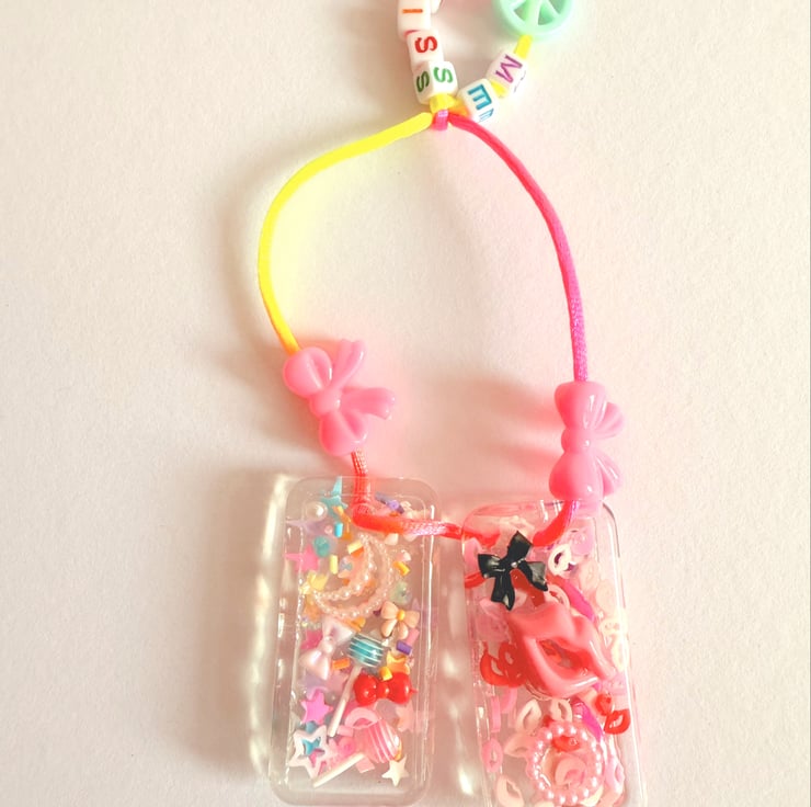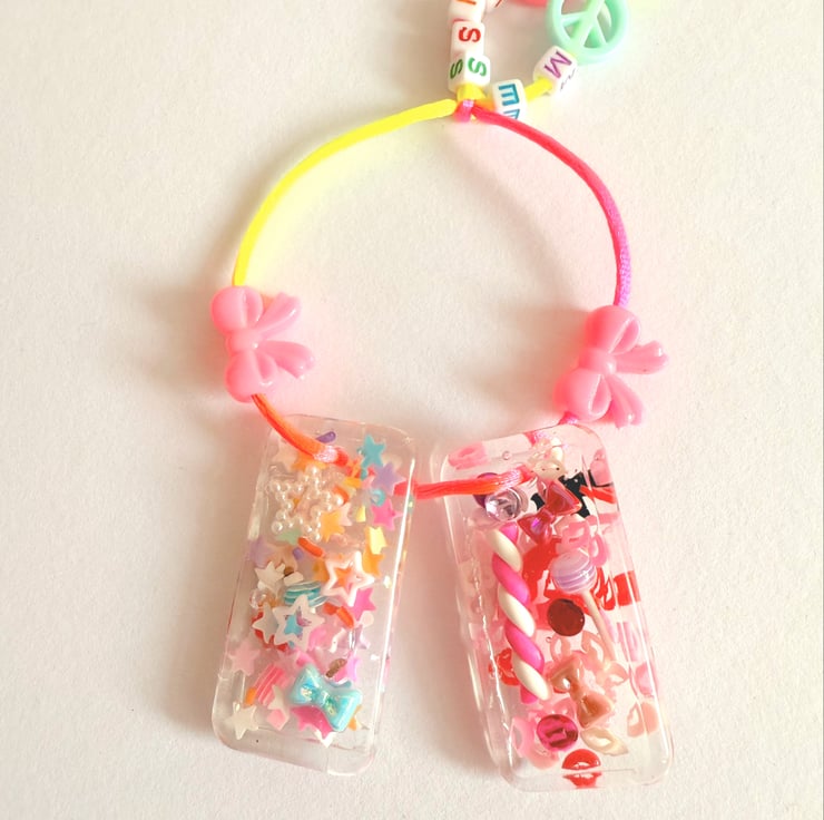 This is a 3 in 1 sensory fidget. For sight, touch and sound. Two worry stones on a trendy cord that sound great when rubbed together and feel great when rubbed on the textured back. Decorated with kisses, peace signs, ribbons, stars, hearts and glitter. This one is for the bold and sweet!