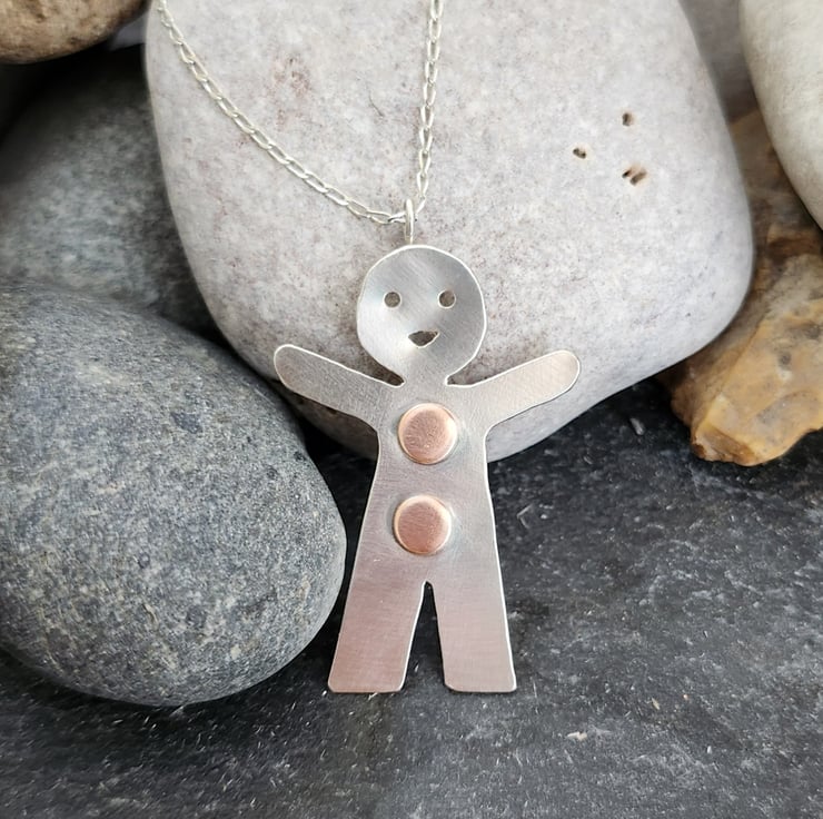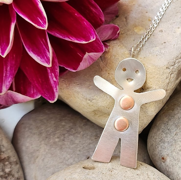 A gingerbreadman cut from sterling silver sheet. He is approximately 3.6mm tall. Copper buttons and a sterling silver loop have been soldered on for the sterling silver chain that comes with it - 16 or 18 inch, please choose when ordering (included in the price)