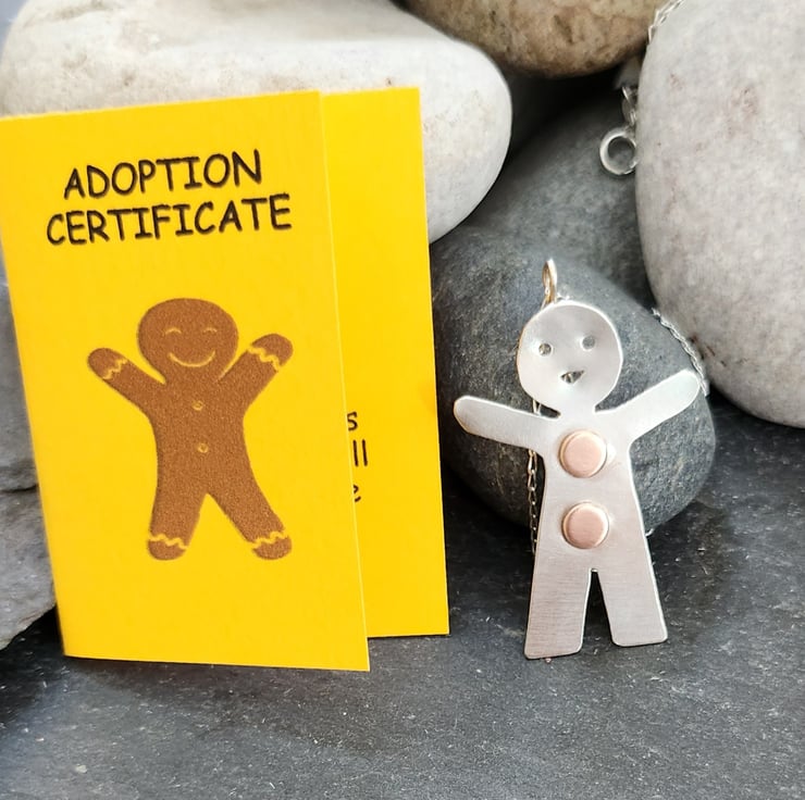 All the gingerbreadmen pendants and brooches I make are individual, I see them as cousins, all slightly different. This one is Eugene and he will come with a little adoption certificate.