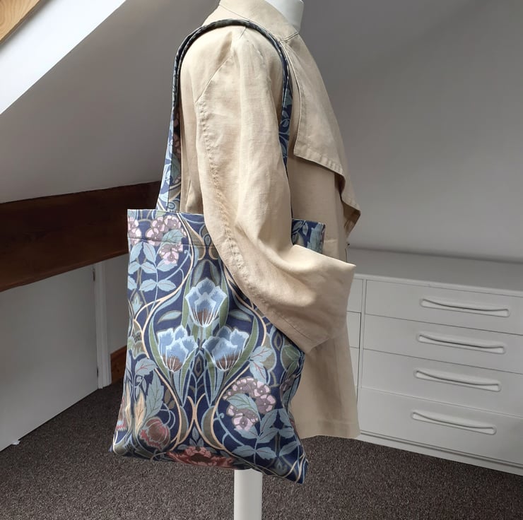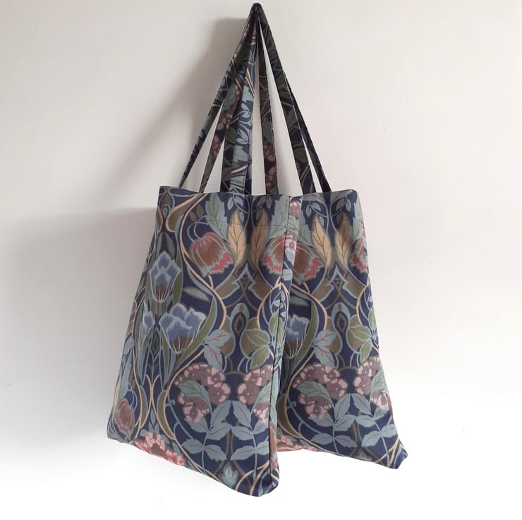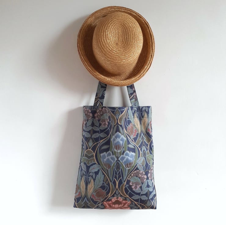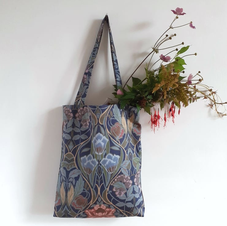 This Art Nouveau style tote or shoulder bag has a pocket and folds up into its own little wallet. It is made from a fabulous fabric remnant with a slight sheen, and has a print of large stylised flowers and tendrils climbing up both sides in a typical Art Nouveau design. Printed in an unusual muted colour range of green pink and lilac it will stand out in the corner shop!