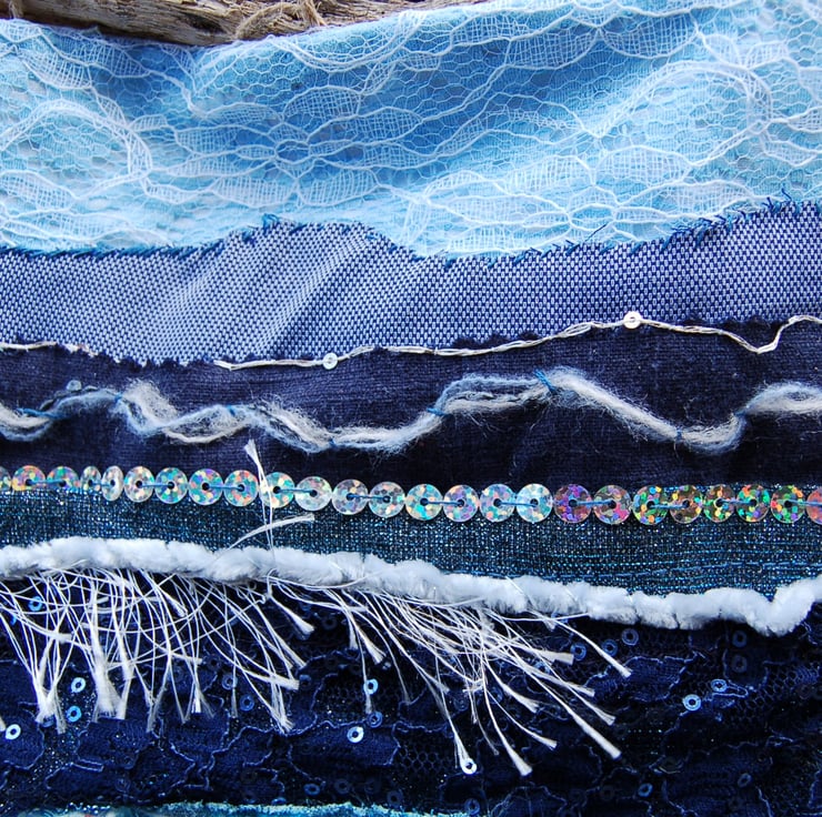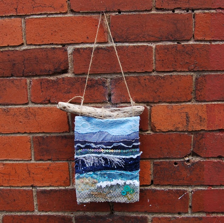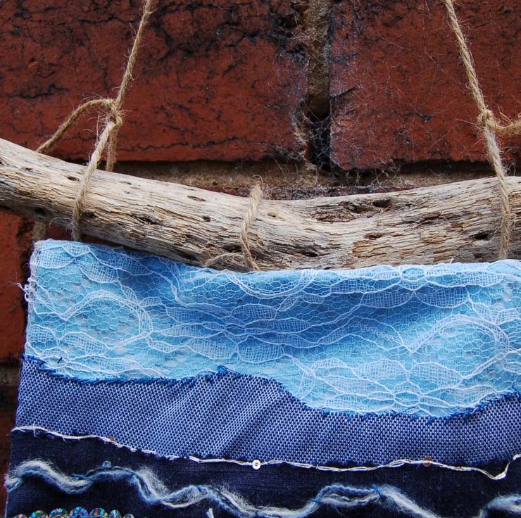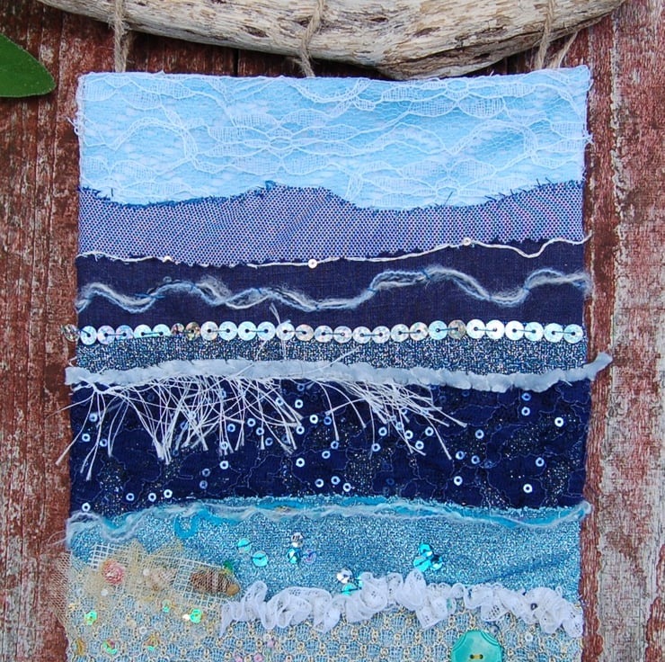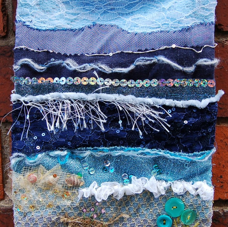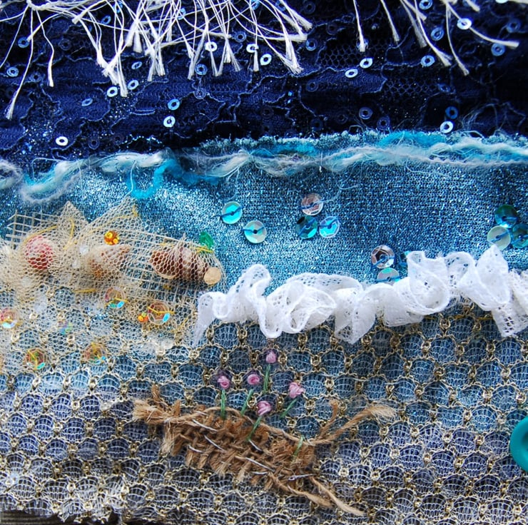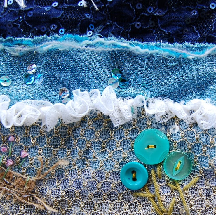 A seascape wall hanging made using offcuts from upcycled fabric, lace, sequins, buttons and fancy yarn.