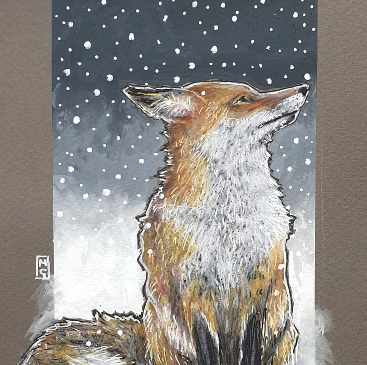 A small original drawing of a red fox on a winter night with snow fall. The drawing is on dark grey pastel paper.