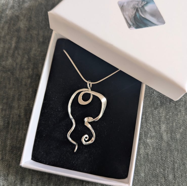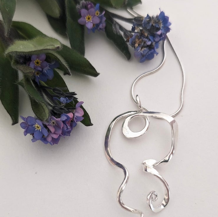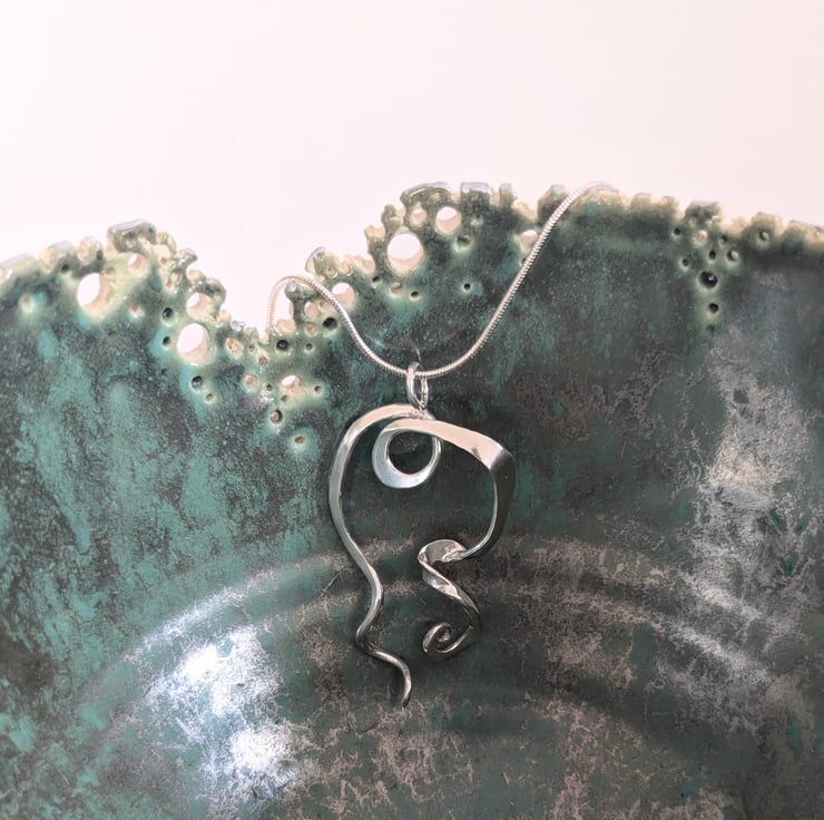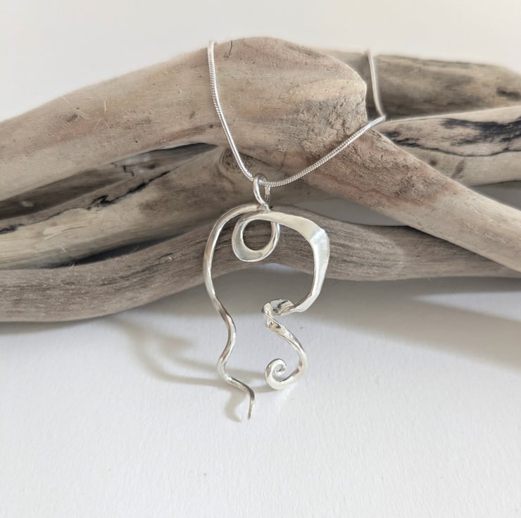 A one of a kind swirly silver pendant made with recycled sterling silver and hung on a sterling silver snake chain necklace.
