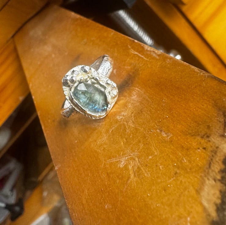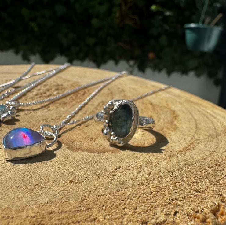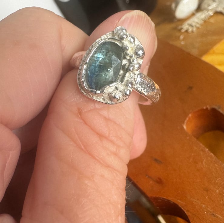 I eventually decided to fashion a chunky, ocean textured band to balance out the delicate seaweed inspired bezel which holds the most incredible bi coloured kyanite. The gemstone is all the colours of water and shimmers as you move. It’s surrounded by tiny silver pebbles which catch the light. A truly magical piece of jewellery that I loved making.