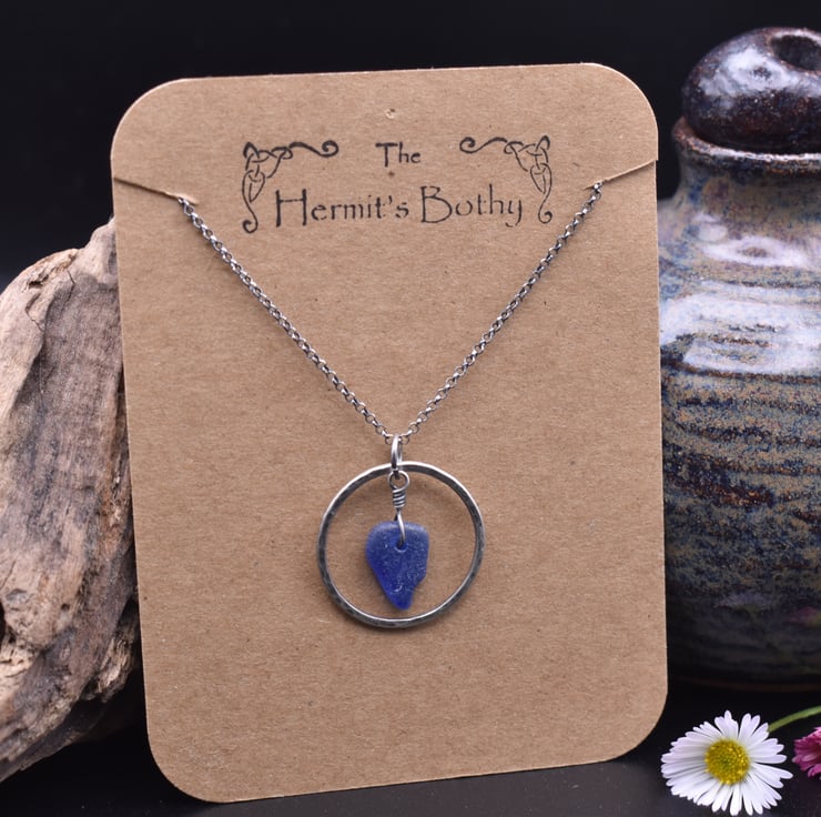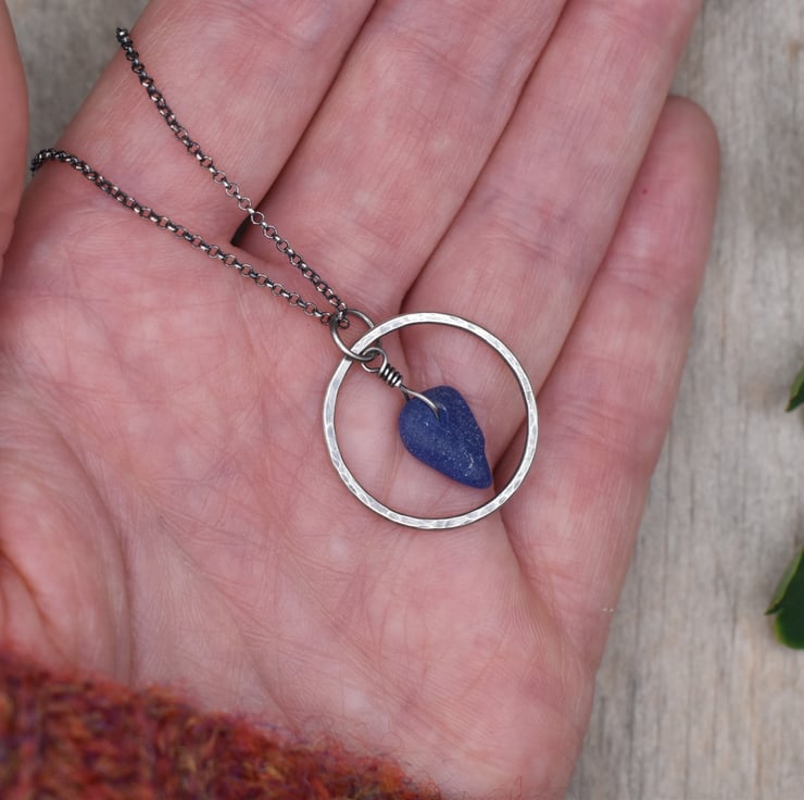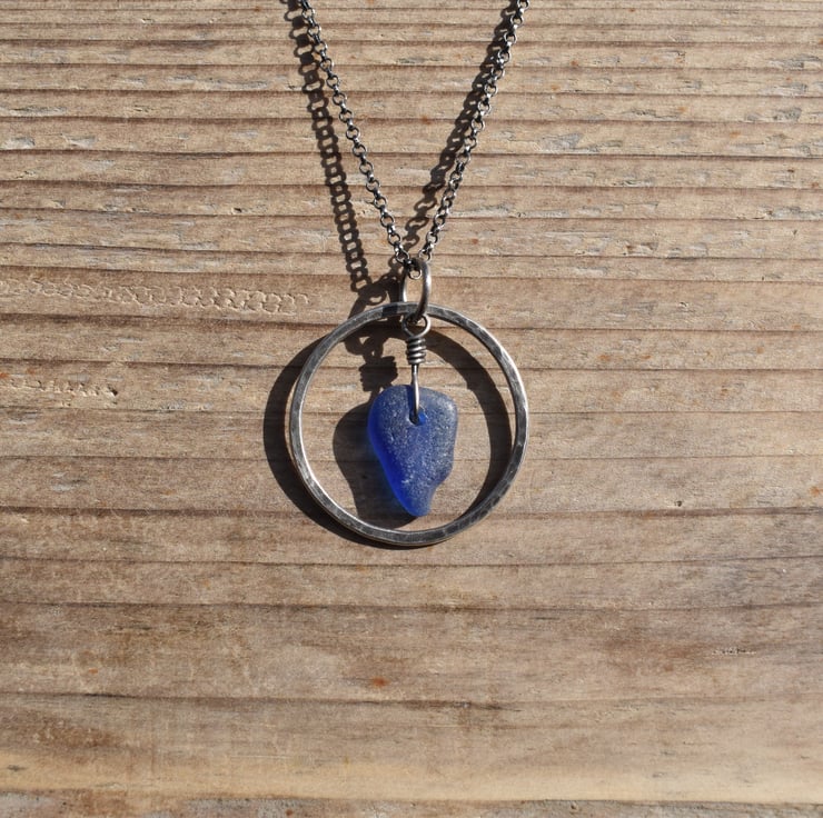 This necklace has been made using recycled sterling silver, and sea glass collected locally in the Scottish Highlands. It features a little piece of deep blue sea glass suspended in a handmade sterling silver 925 hoop, which has been hammered for texture. All the sterling silver components have been oxidised using liver of sulphur to give an antiqued finish. The pendant comes with a sterling silver belcher chain with a bolt ring clasp, in a length of either 45cm (18 inches) or 50cm (20 inches) - please specify when ordering which chain length you would prefer (please refer to length reference photo).