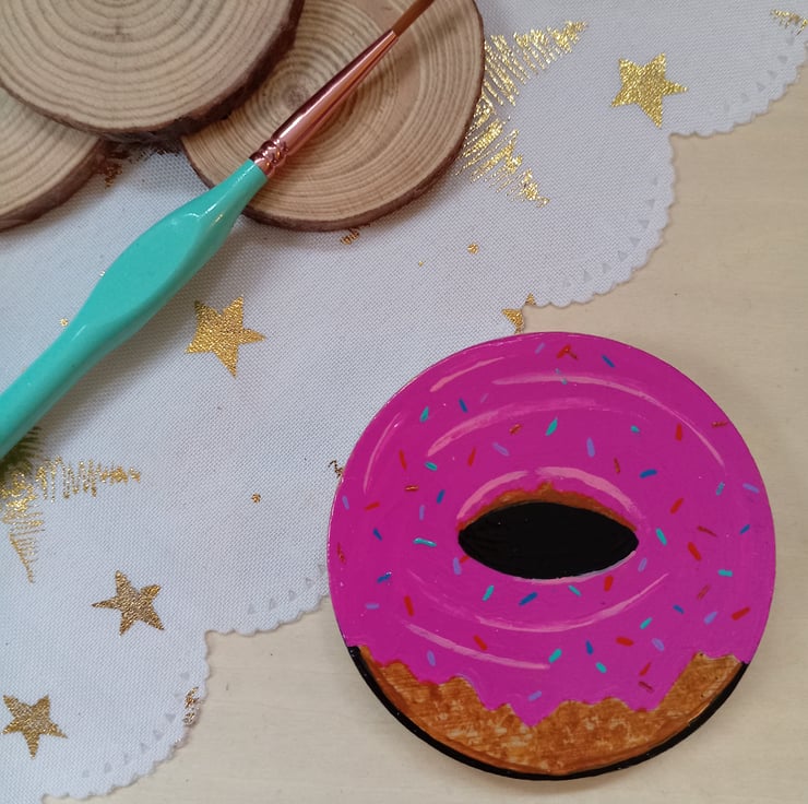 A 7.2cm wooden pocket mirror that has been hand painted in a pink iced donut design with coloured sprinkles