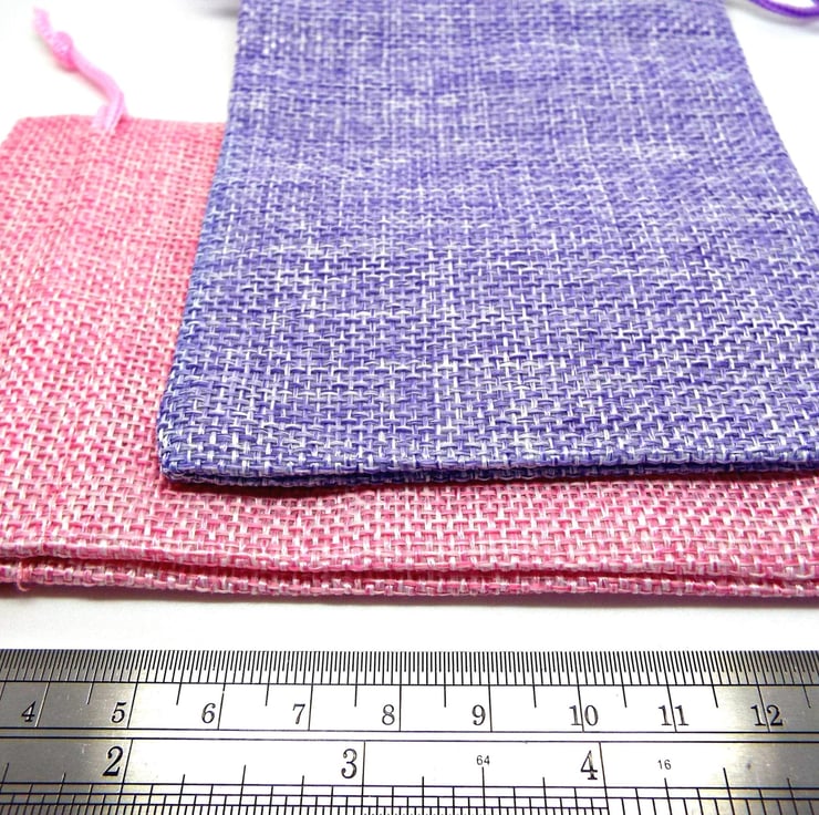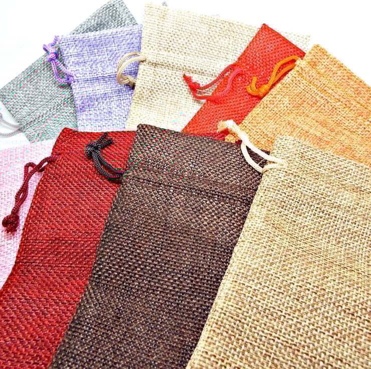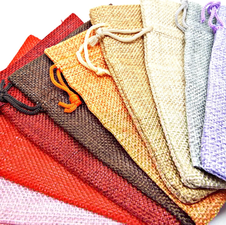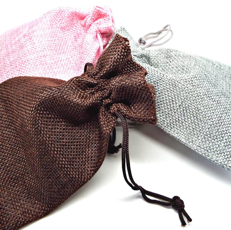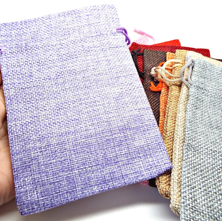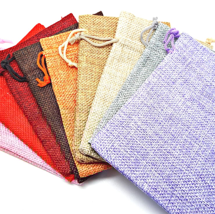 Pack of 5 Hessian Burlap Style Drawstring Bags in 5 Different Colours. Perfect packaging for your Handmade Jewellery & Gifts. You will receive 5 random colours. If you'd like a custom mix, please get in touch before ordering