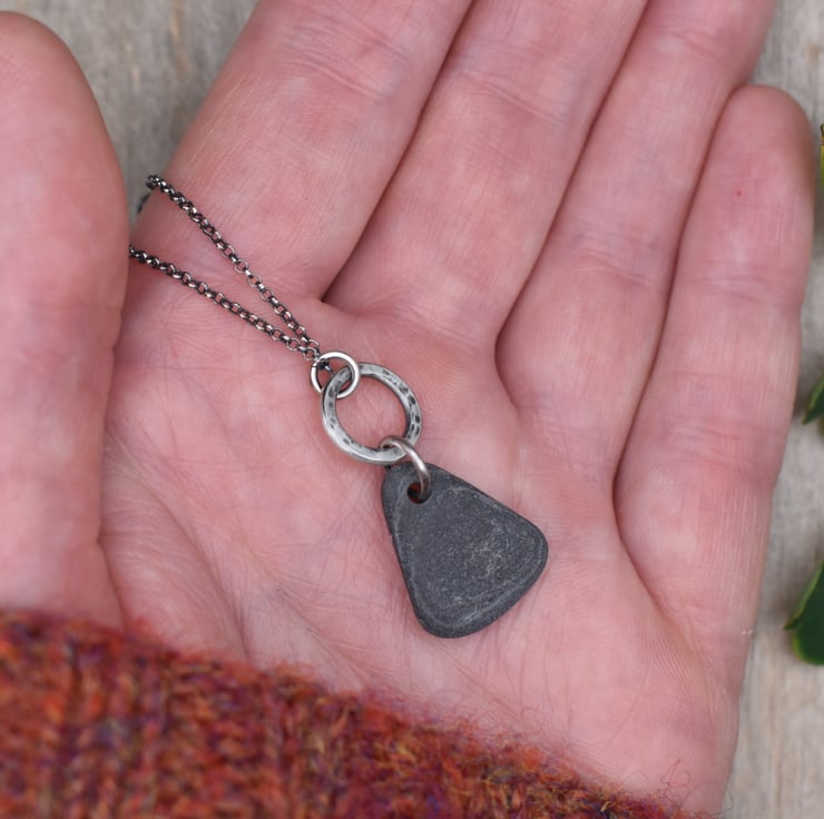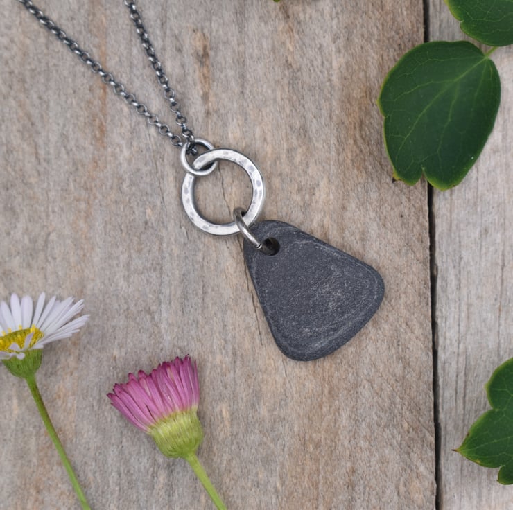 This necklace has been made using recycled sterling silver, and a beach pebble collected locally in the Scottish Highlands. It features a neat little triangular-shaped pebble, suspended beneath a small sterling silver 925 hoop that has been hammered for texture. All the silver components have been oxidised using liver of sulphur to give an antiqued finish. The pendant comes with a sterling silver belcher chain with a bolt ring clasp, in a length of either 45cm (18 inches) or 50cm (20 inches) - please specify when ordering which chain length you would prefer (please refer to length reference photo).