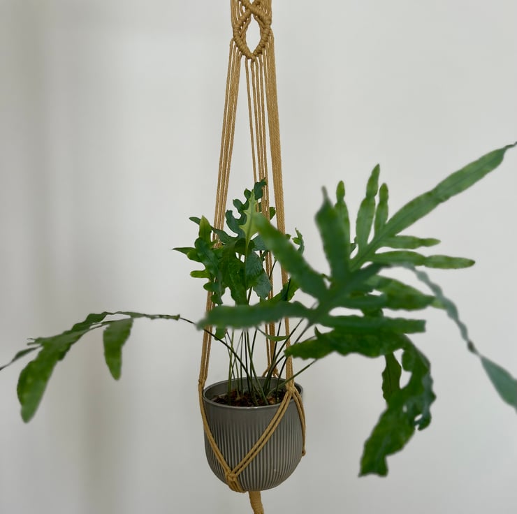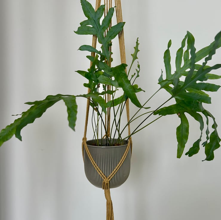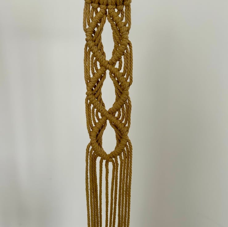 This macramé plant hanger has been handmade with love using 3mm recycled cotton cord and a wooden ring.