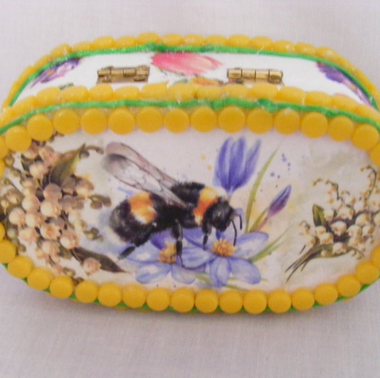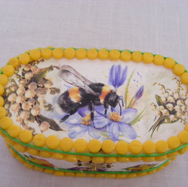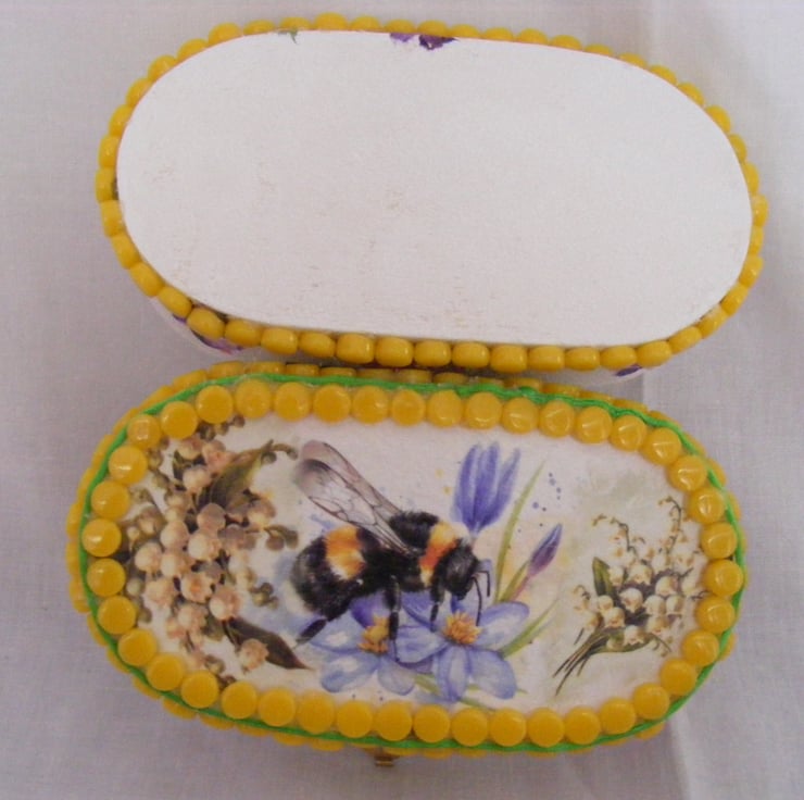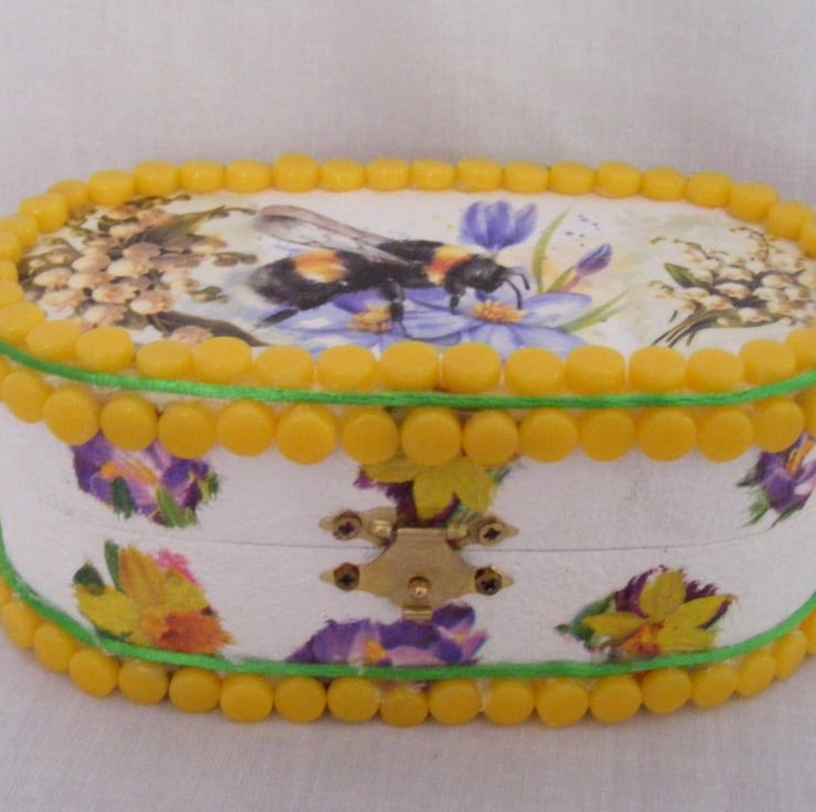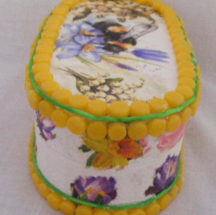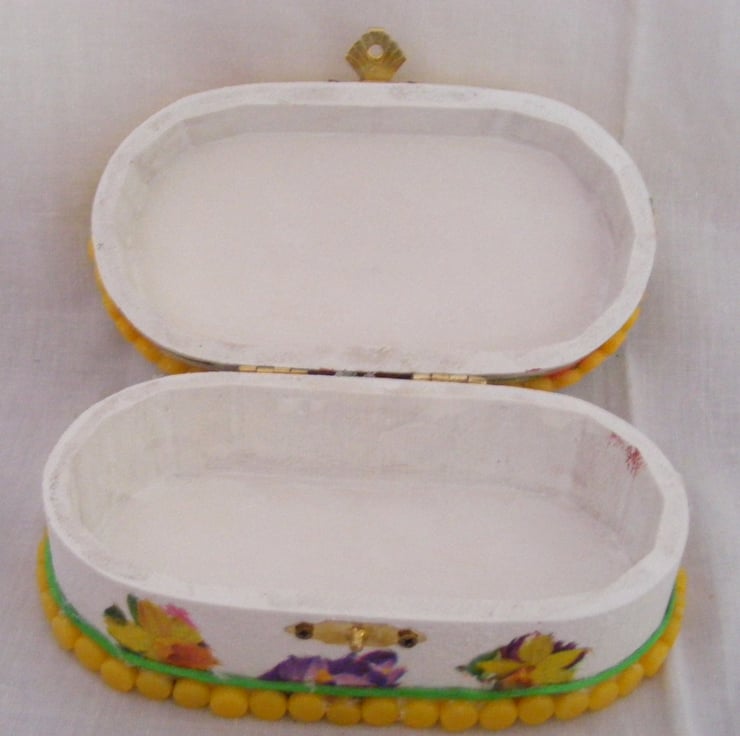 This oval box has been painted white inside and out with acrylic paint. I've decoupaged the top and sides. Edges of the box have yellow mosaic dots glued on with a green strand of satin cord around the top and bottom. Jewellery/ memory box would make a beautiful gift or why not treat yourself.