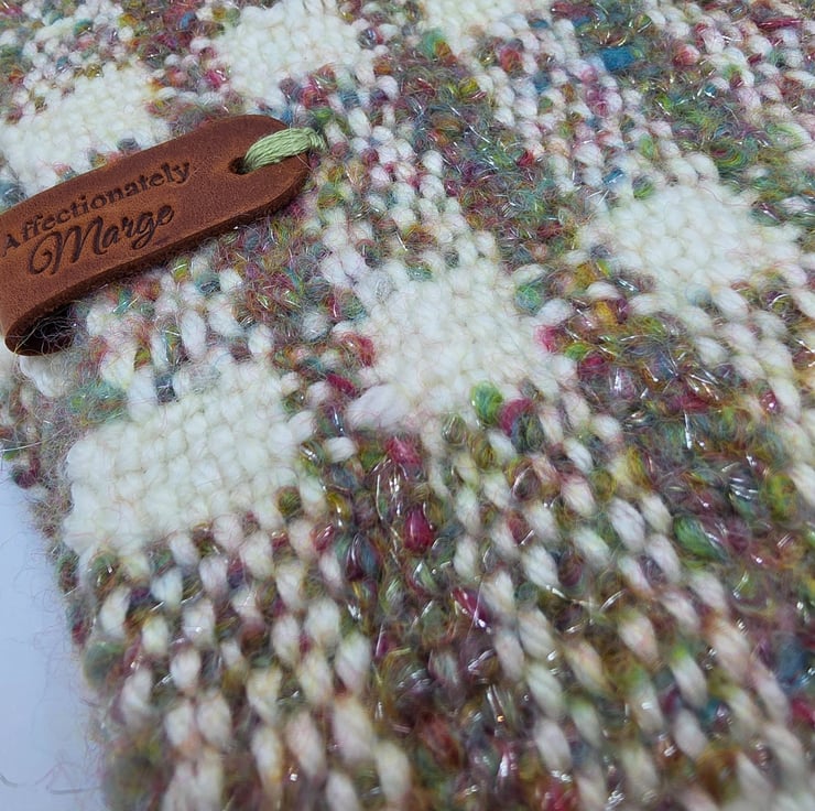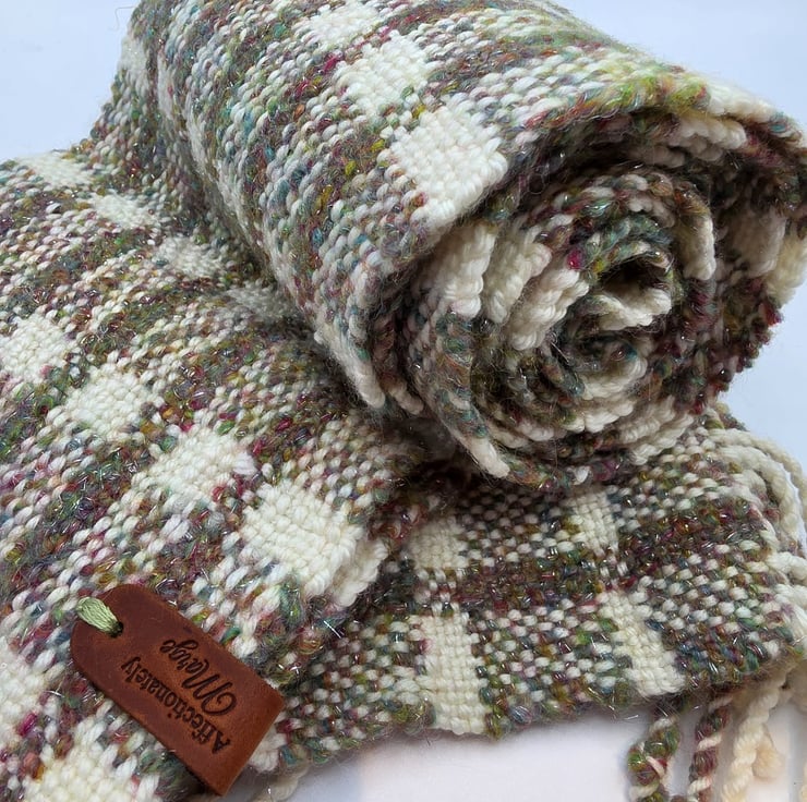 This scarf is handwoven and the fibers that make up its dna are Green Merino with Angelina and undyed Merino.