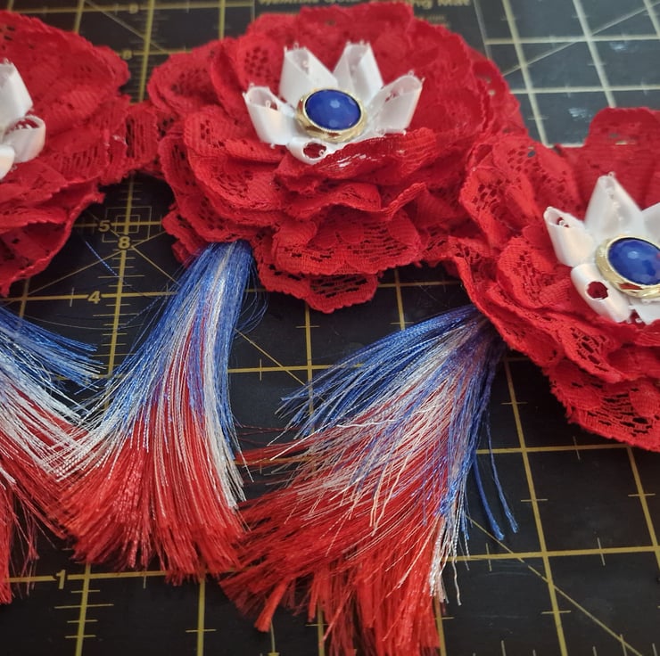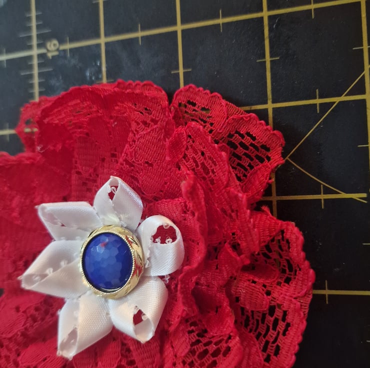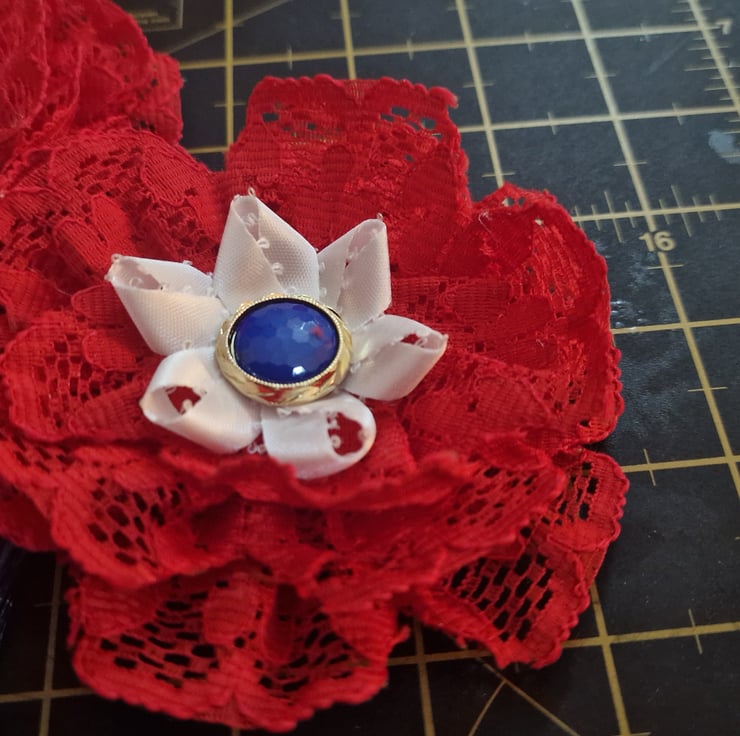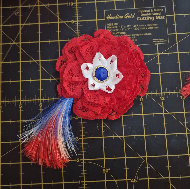 Handmade flower made with ribbon, lace, handmade feather with a lovely little button in the middle.
