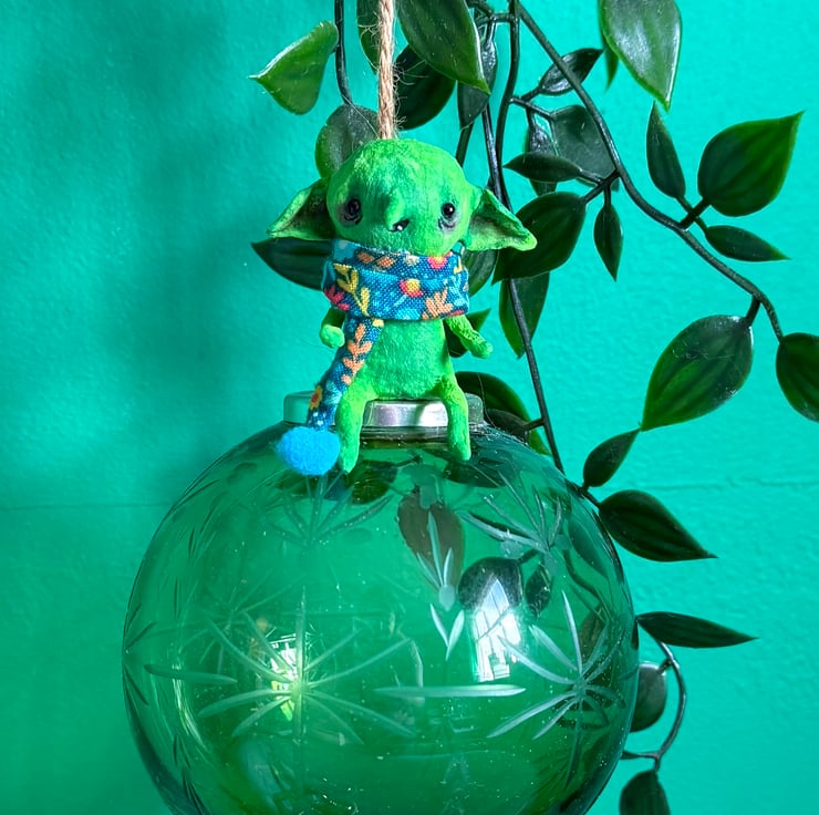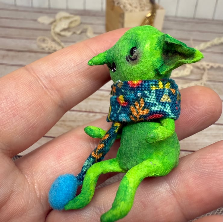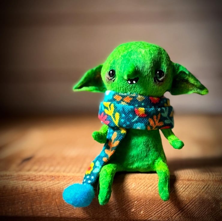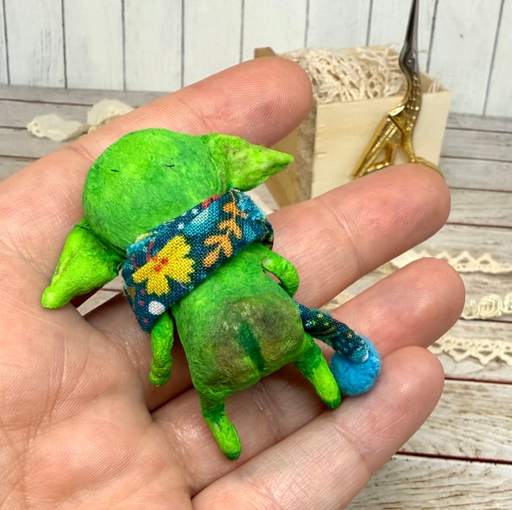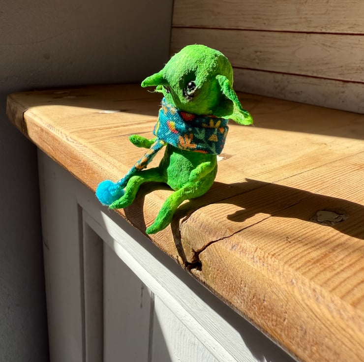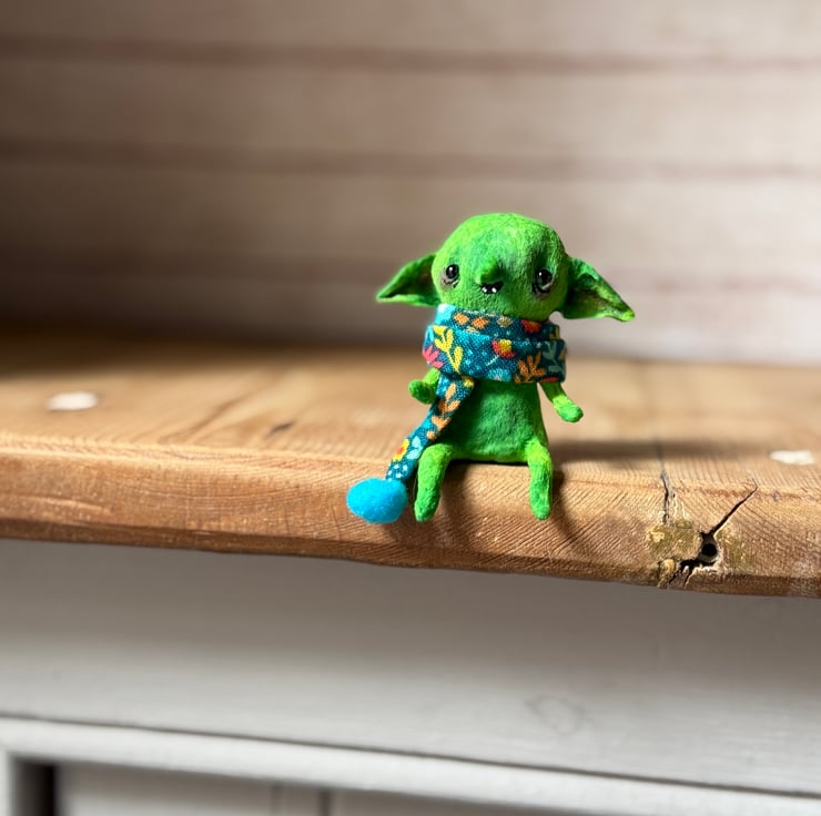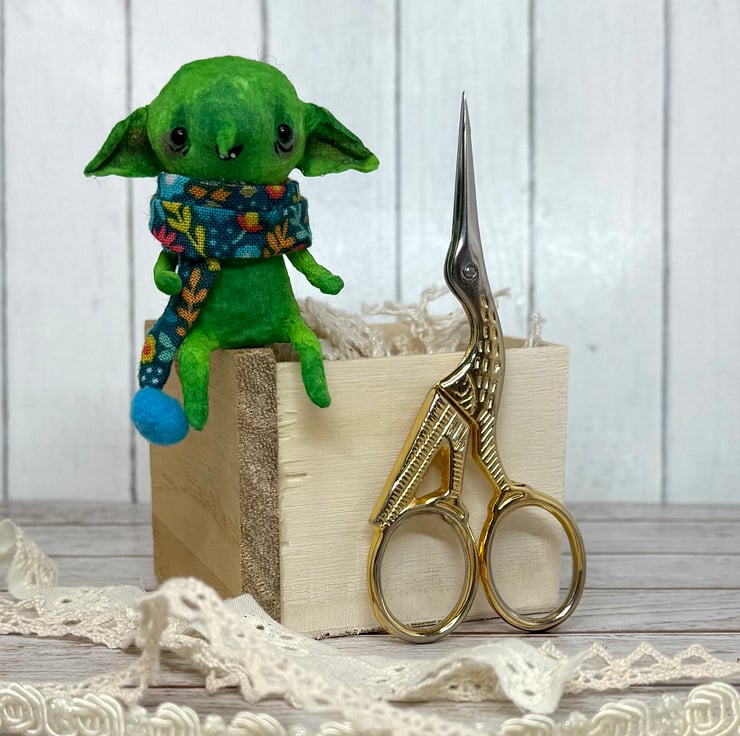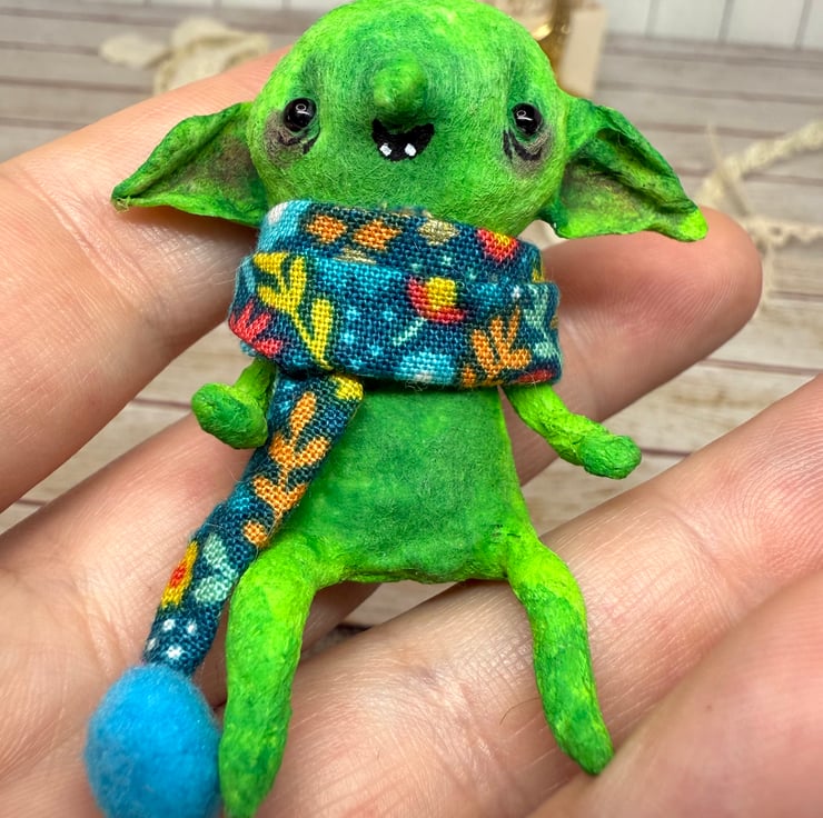 Handmade miniature spun cotton art doll. Goblin is hand painted with glass bead eyes. Goblin wears a sewn fabric scarf with bright Pom Pom attached. This goblin sits beautifully on a shelf or table. Goblin measures roughly 4.5cm tall from bottom to head and 5.5cm including legs.