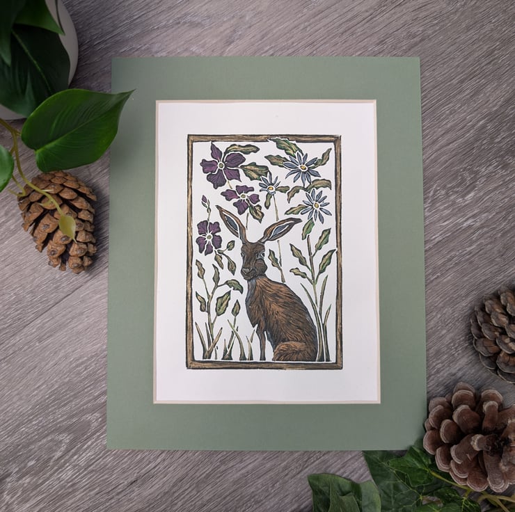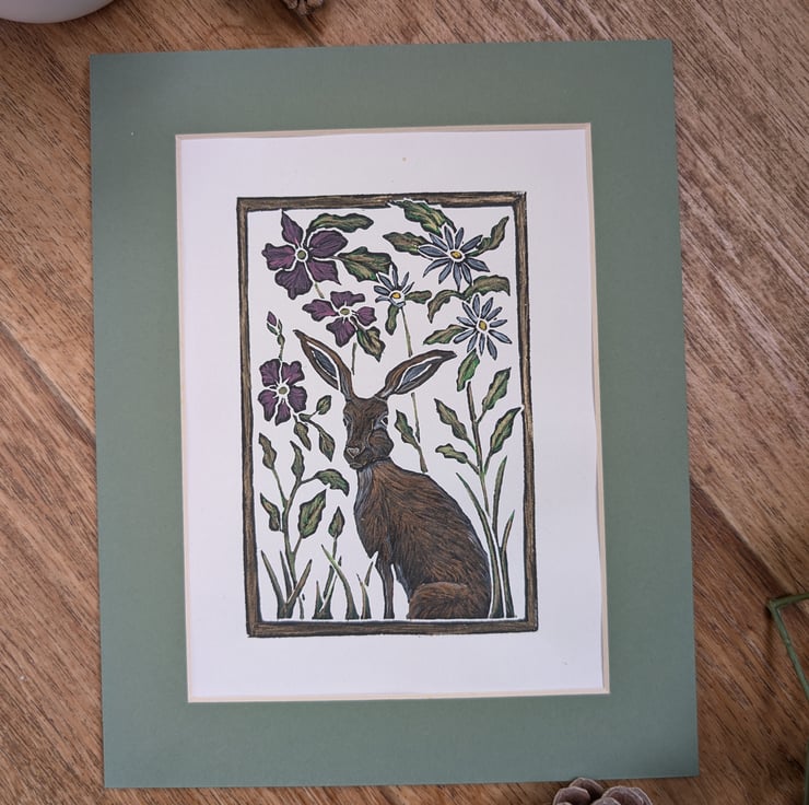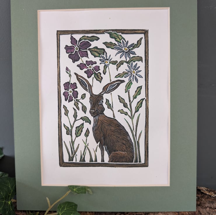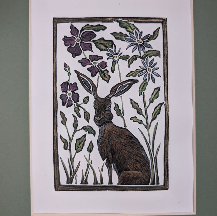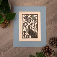 Printed with black ink on white 130gm Daler Rowney smooth cartridge paper, then finished with hand painted details, to add some colour.