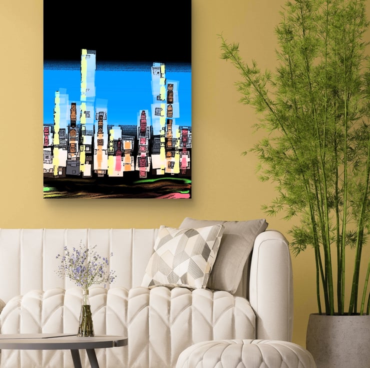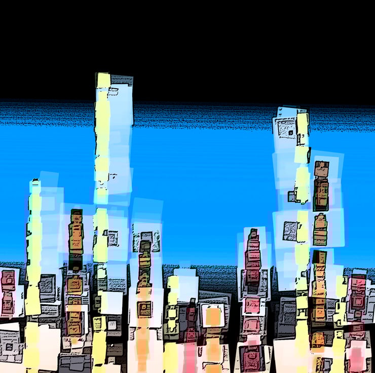 One of my first pictures to explore drawing with blocks (squares / cubes). Having created the picture I then inverted the colour to give a bold look to the cityscape with a neon feel to the lights.