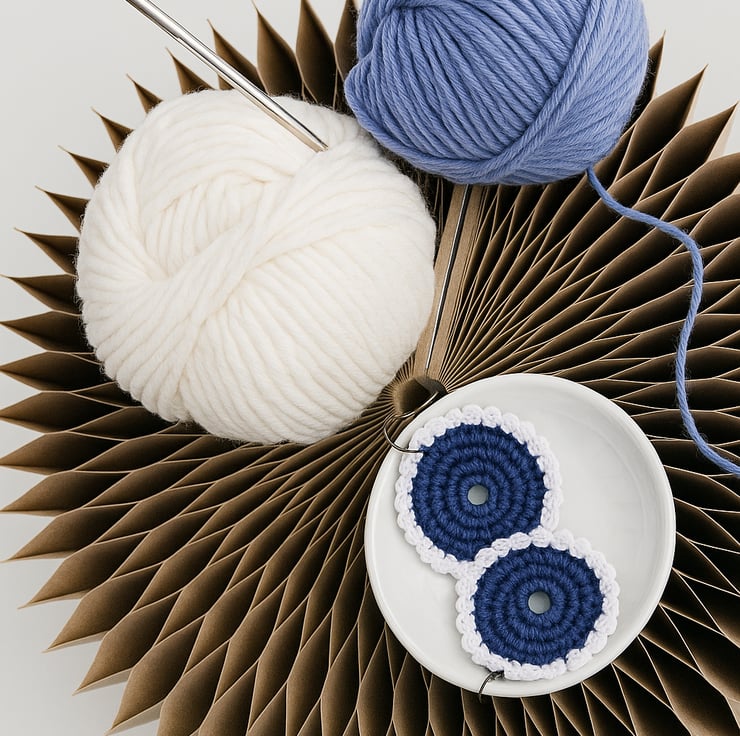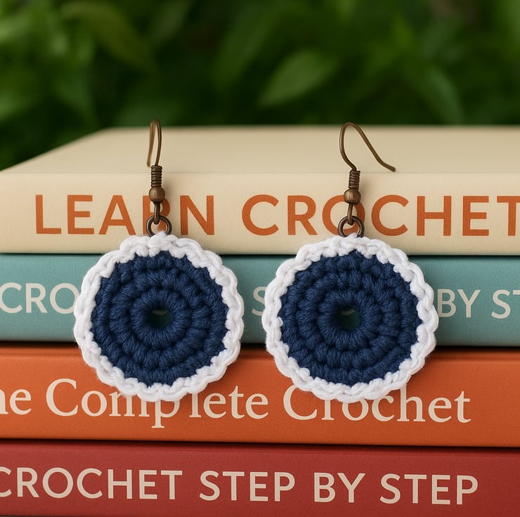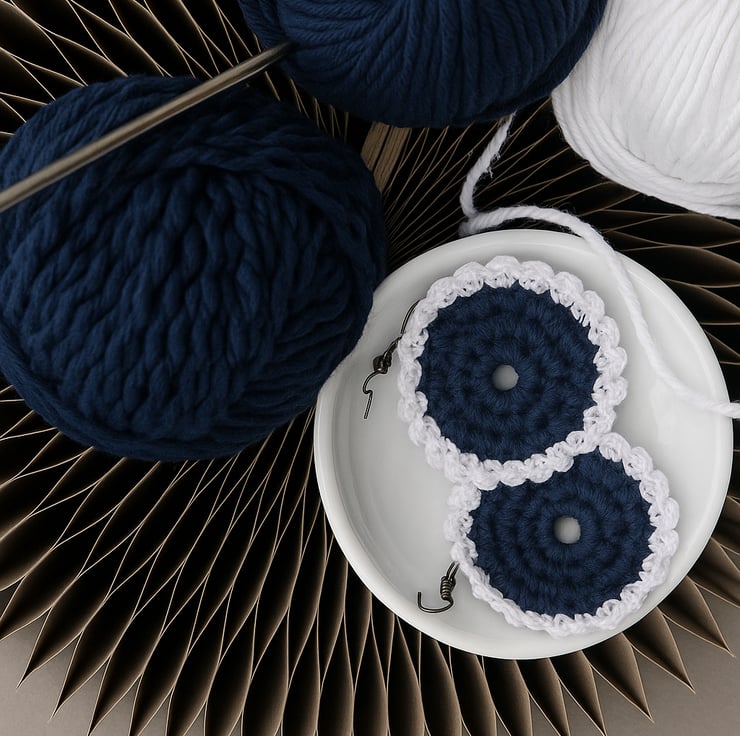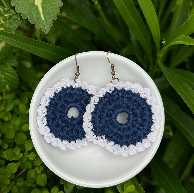Delicately handcrafted with love, these round crochet earrings feature a timeless blend of crisp white and deep navy blue. Lightweight, elegant, and one-of-a-kind – perfect for adding a touch of charm to any outfit.