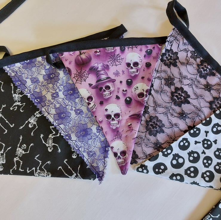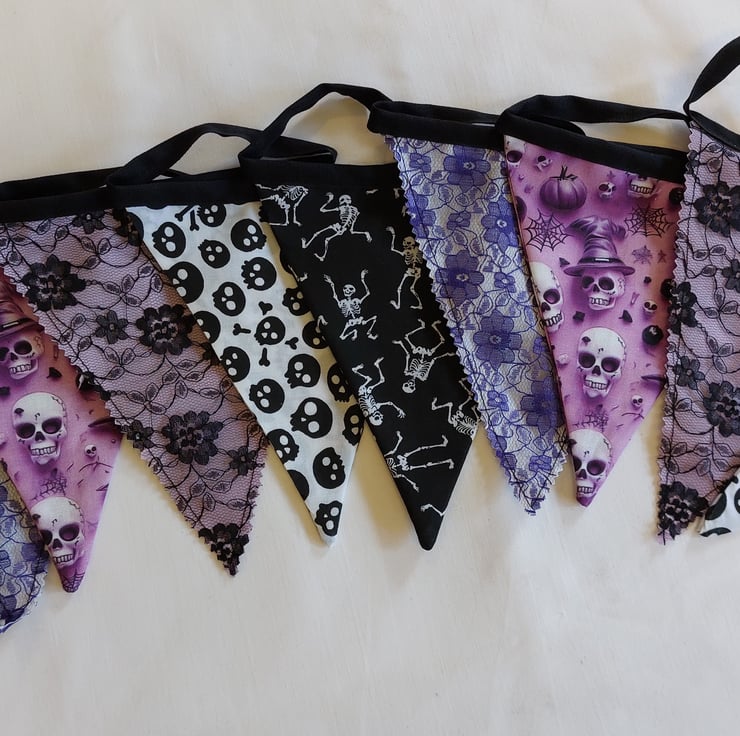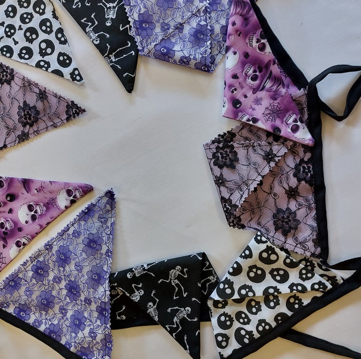 Handmade Gothic style bunting using a mixture of polycotton, lace, and cotton fabric. Each double sided flag measures 16cm x 20cm, ten flags in total, 3.5 metres in length and stitched to a black cotton tape. Extra tape at either end for tying