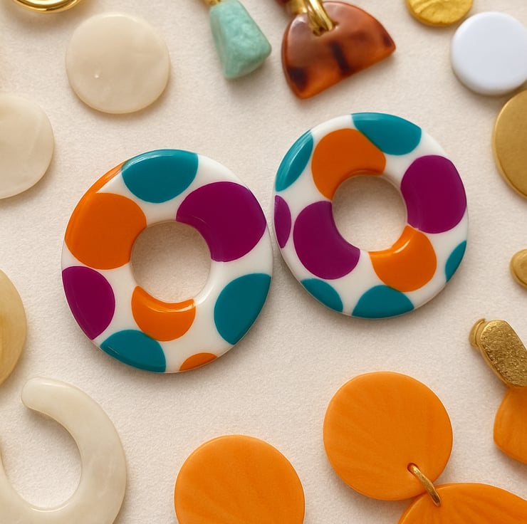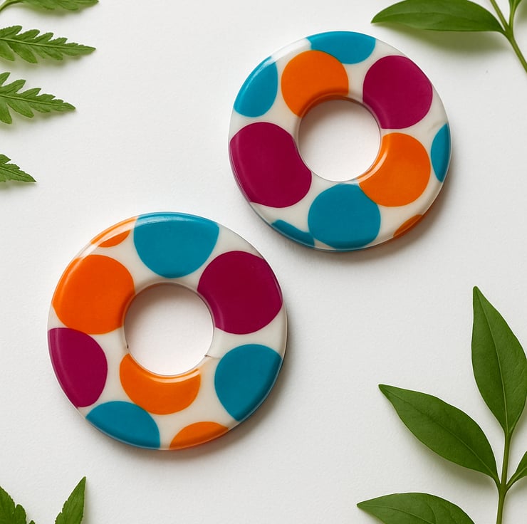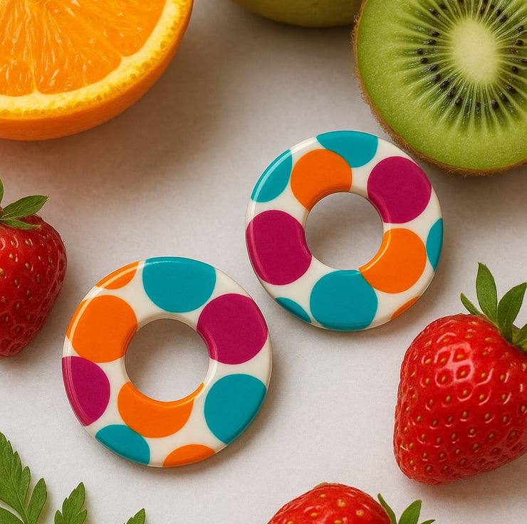 Bring a playful, summery vibe to your look with these handcrafted round crochet earrings. Featuring a crisp white base adorned with colorful polka dots, they’re lightweight, cheerful, and perfect for adding a fun pop of color to any outfit. Ideal for everyday wear or sunny day adventures.