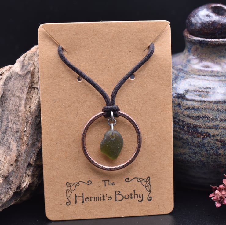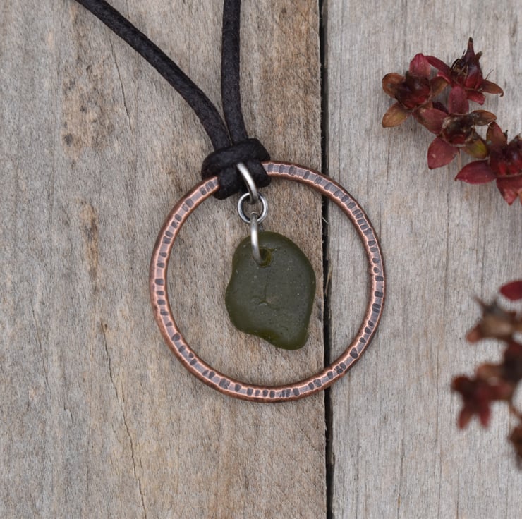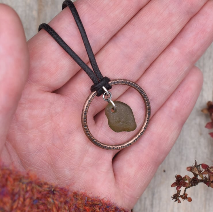 This necklace has been made using copper, recycled sterling silver, and sea glass collected from a local Highland beach. It features a little piece of dark olive green sea glass suspended by sterling silver jump rings in a handmade copper hoop, which has been hammered for texture. The 2mm brown waxed cotton cord features sliding knots, so the necklace can be adjusted to the desired length.
