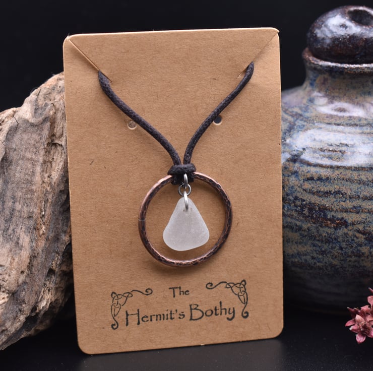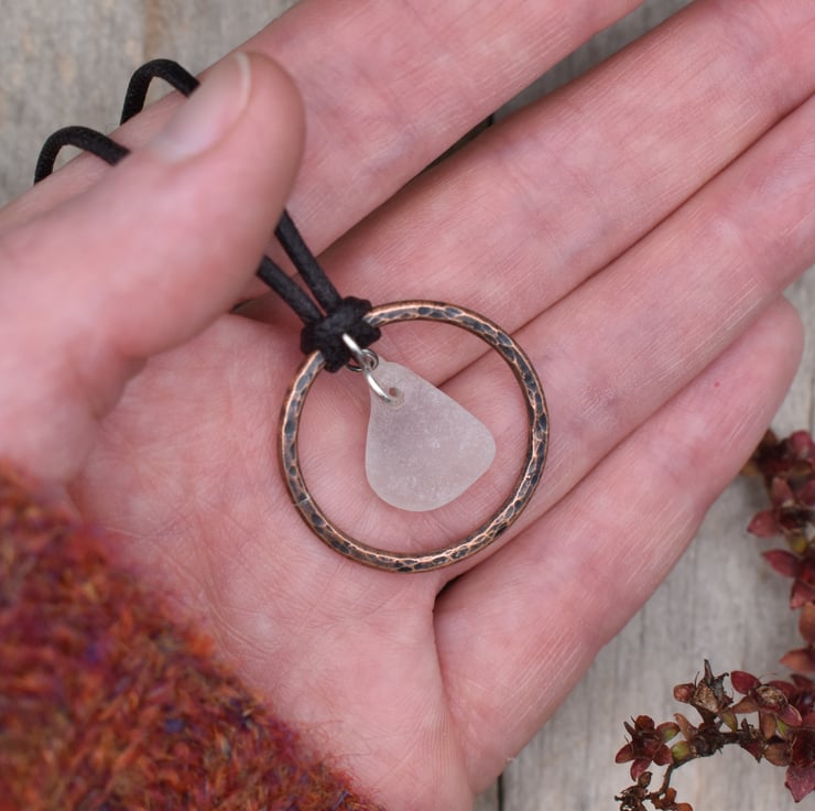 This necklace has been made using copper, recycled sterling silver, and sea glass collected from a local Highland beach. It features a piece of frosted white sea glass suspended by sterling silver jump rings in a handmade copper hoop, which has been hammered for texture. The 2mm brown waxed cotton cord features sliding knots, so the necklace can be adjusted to the desired length.