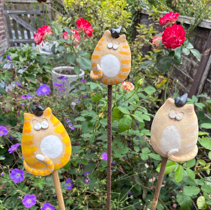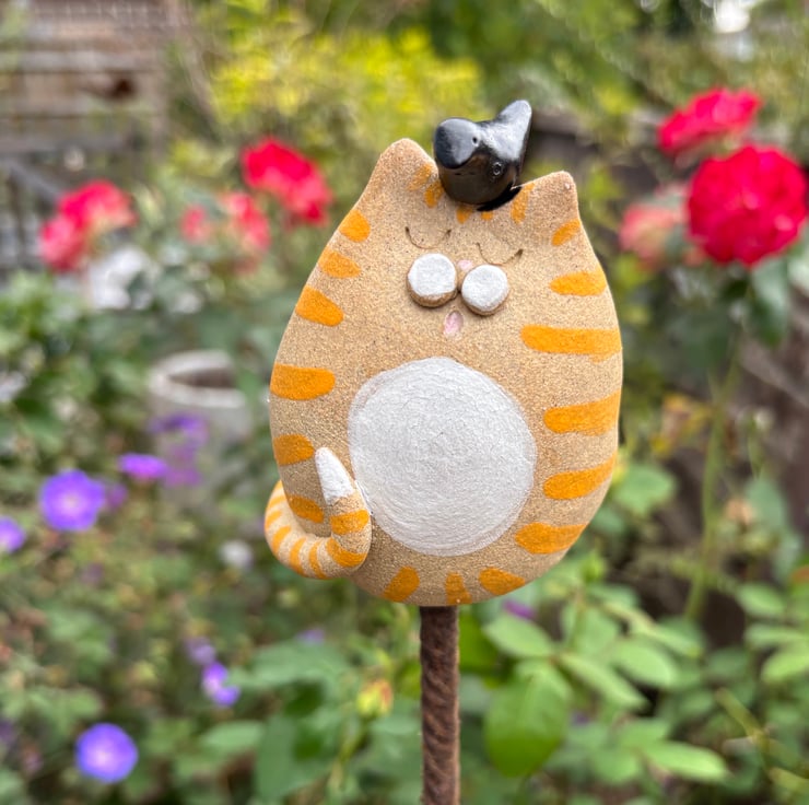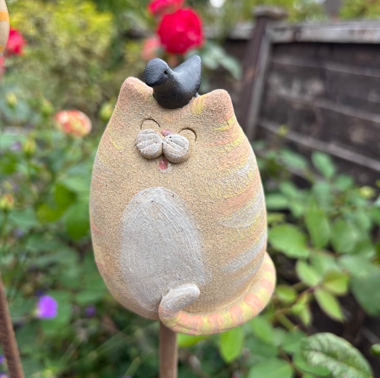 Ginger tabby cat to sit on top of your garden cane, helping to prevent accidents while providing all round colour in the garden. Made from high fired stoneware clay this is completely frost proof and happy to stay outside in all weathers.