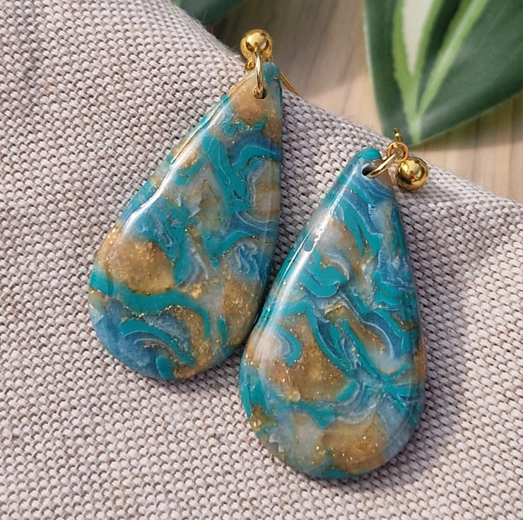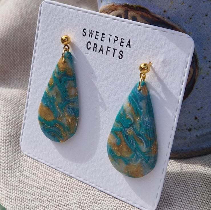 Handmade with care, these Teardrop earrings are crafted from lightweight polymer clay, making them comfortable enough to wear all day. Each pair is unique, no two are exactly the same, giving you a truly one-of-a-kind accessory. Approximately 45mm long.