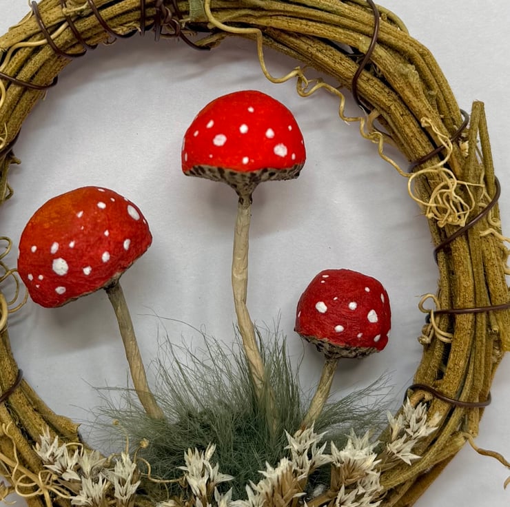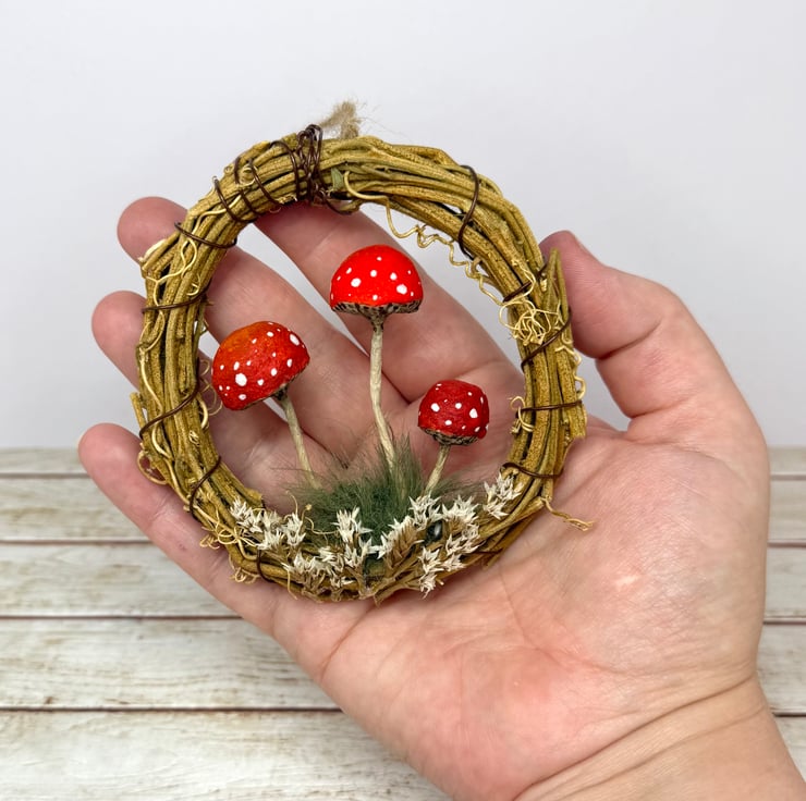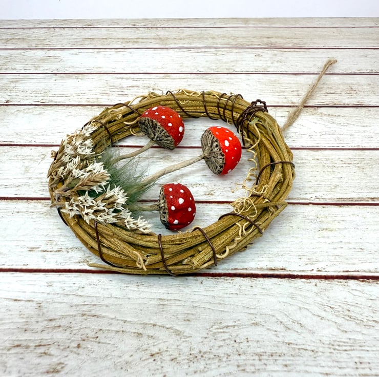 A beautiful little hoop measuring roughly 10cm across. This hoop is decorated with dried flowers and fluffy upcycled fabric ‘moss’. Three twisty spun cotton mushrooms decorate the centre, hand painted with wired stems and sewn into place. Comes with a jute twine hanger attached.