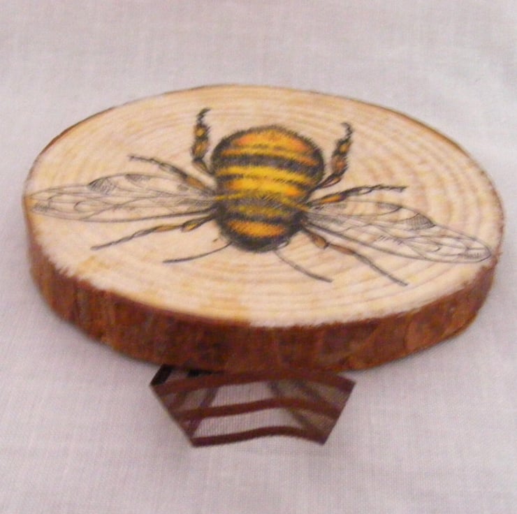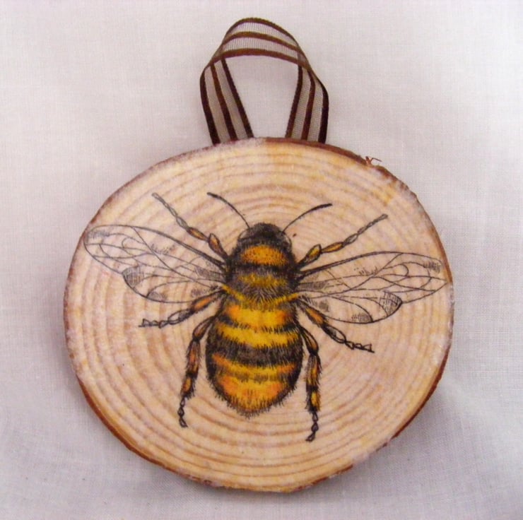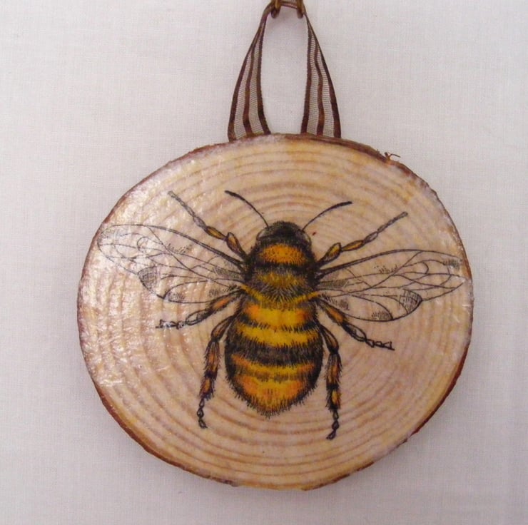 I've handmade this bee wall hanging using a log slice which I've decoupaged with a bee napkin and varnished. Back of the log slice is felted. I've used ribbon to make the hanger. A lovely gift for any wildlife lovers.