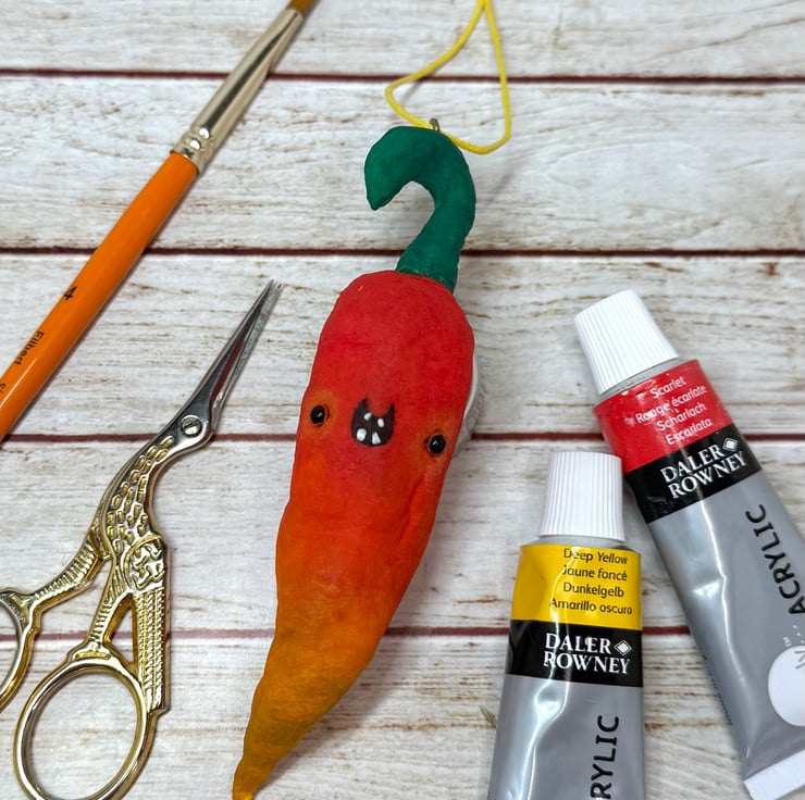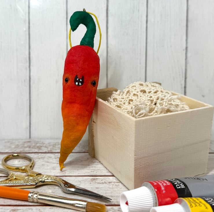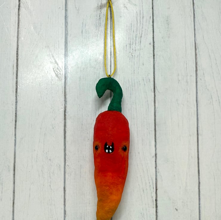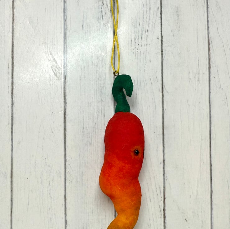 A saucy chilli pepper with glass bead eyes and round bottom. This pepper is hand painted and goes from fiery red to spicy yellow. Pepper measures roughly cm tall and comes with waxed thread hanger. Pepper is made from spun cotton. 11cm