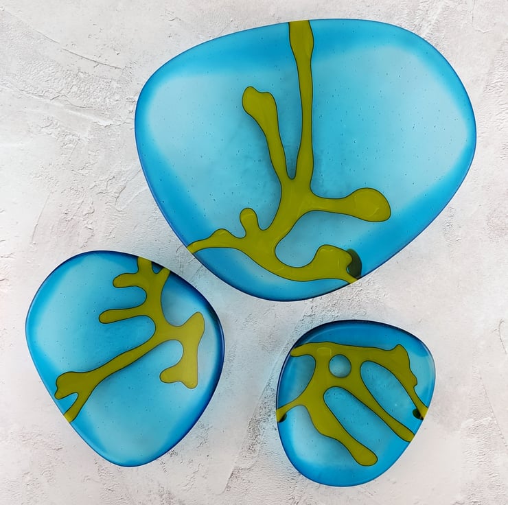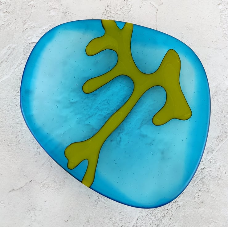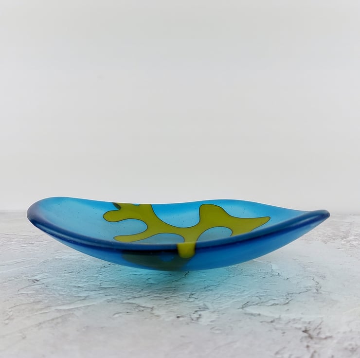 This is a medium sized dish from my 'Seaweed' collection of seaglass style kiln-formed glass dishes. The colour is a vivid turquoise blue with a green seaweed motif. The bowl has an organic shape with smooth rounded edges and a rounded base and a satisfyingly weighty feel to it. And a lovely tactile satin finish to the glass surface (just like sea glass) means you won't be able to resist stroking it!