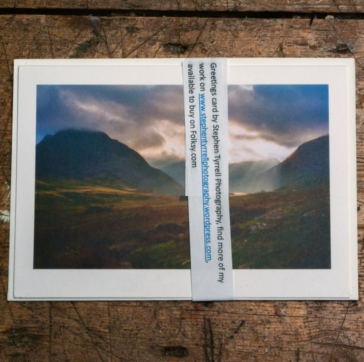 An A6 greetings card of the view from near Glan Llugwy in the Ogwen Valley, with dramatic light from crepuscular rays over Tryfan and Llyn Ogwen. A classic mountain landscape scene from Eryri/Snowdonia. From an original image captured on 35mm film and reproduced digitally.